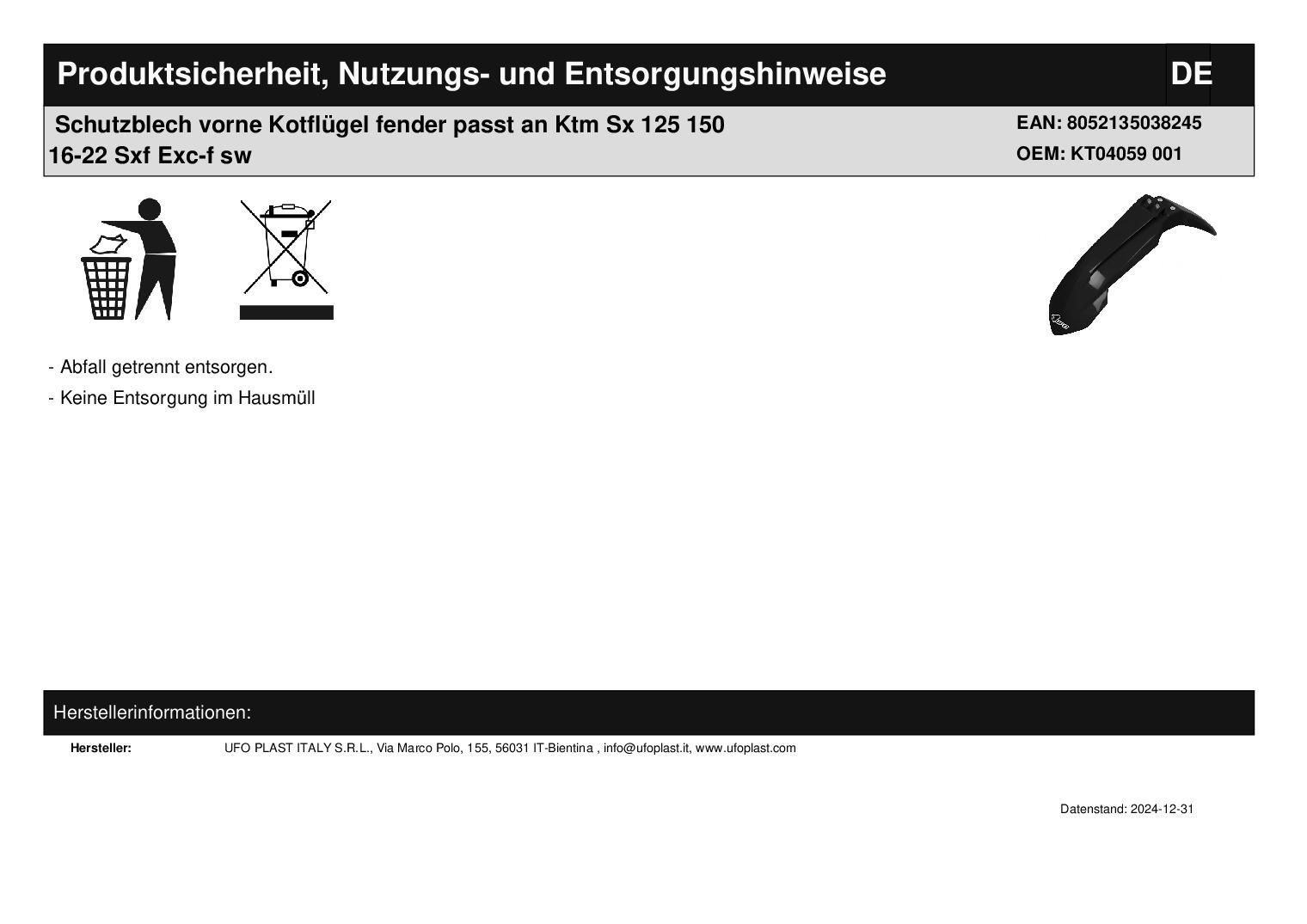Schutzblech vorne Kotfl?gel fender passt an Ktm Sx 125 150 16-25 Sxf Exc-f sw