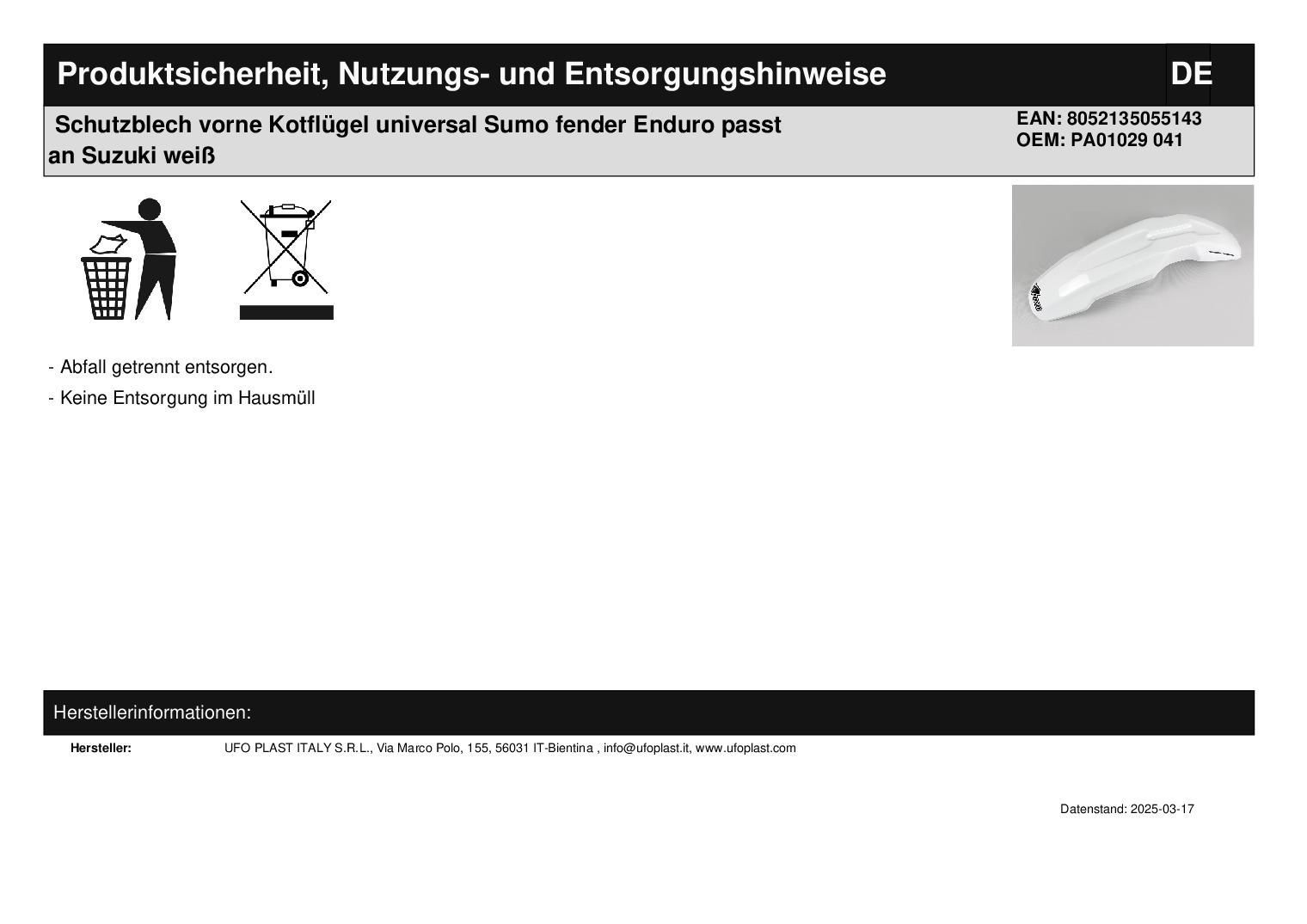 Schutzblech vorne Kotfl?gel universal Sumo fender Enduro passt an Suzuki wei?