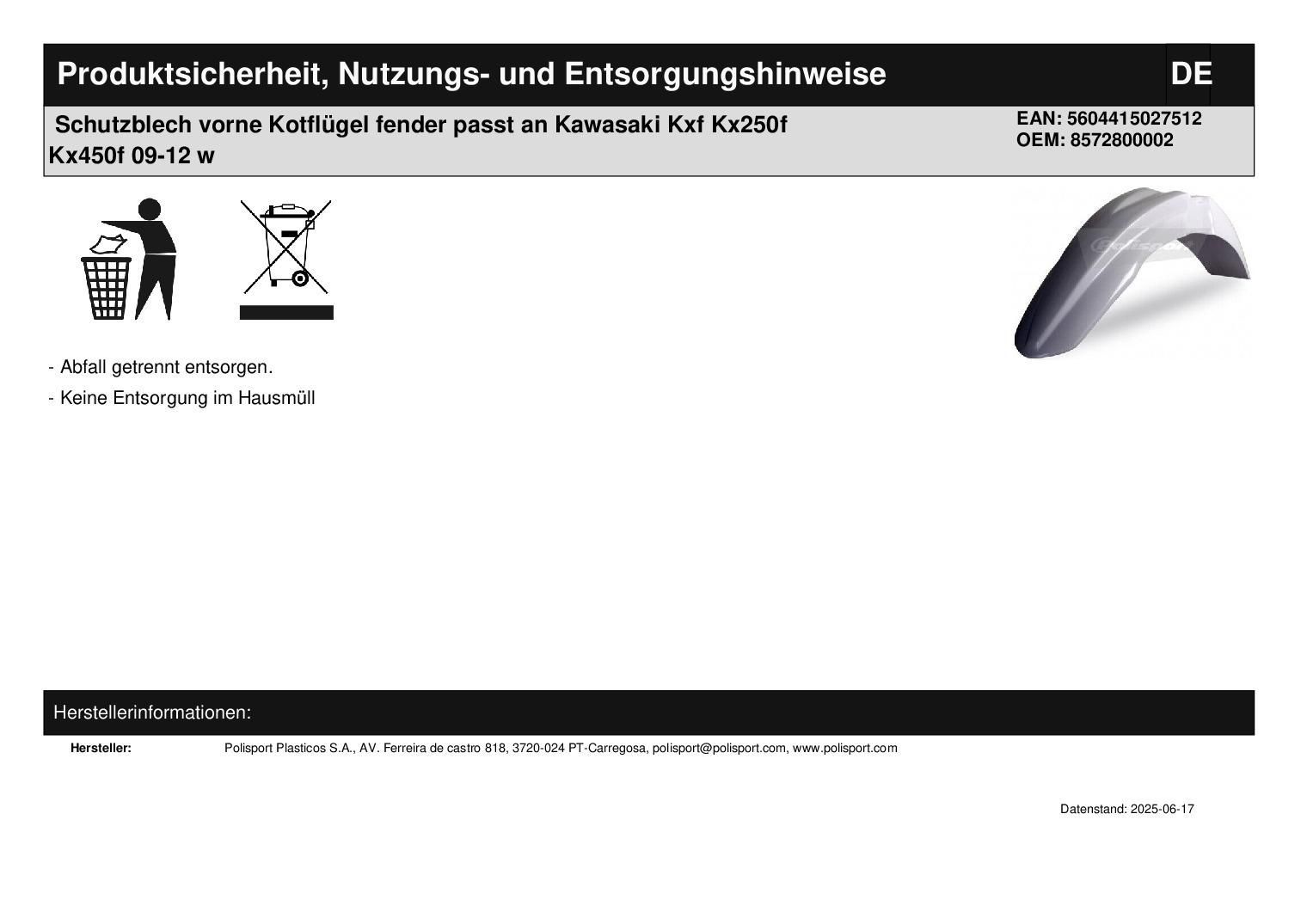Polisport Schutzblech vorne Kotflügel fender passt an Kawasaki Kxf Kx250f Kx450f 09-12 w