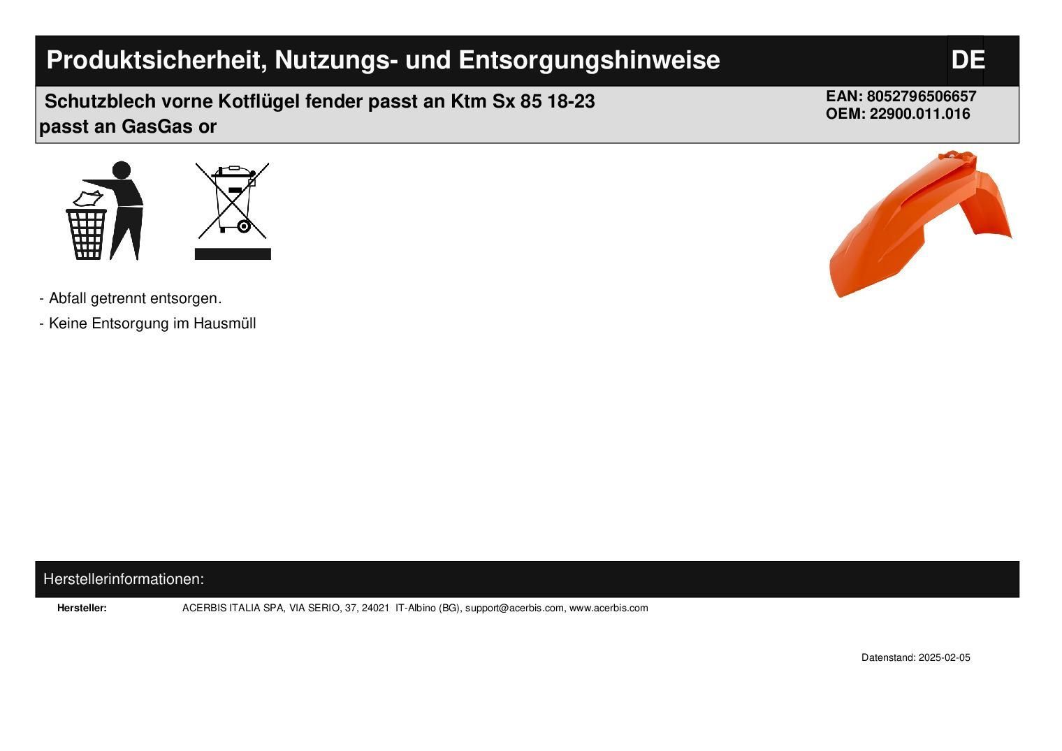 Acerbis Schutzblech vorne Kotflügel fender passt an Ktm Sx 85 18-23 passt an GasGas or