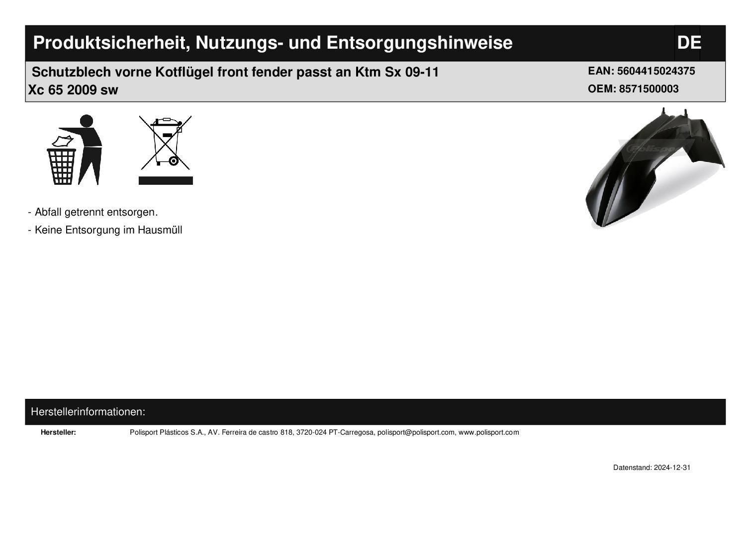 Polisport Schutzblech vorne Kotflügel front fender passt an Ktm Sx 09-11 Xc 65 2009 sw