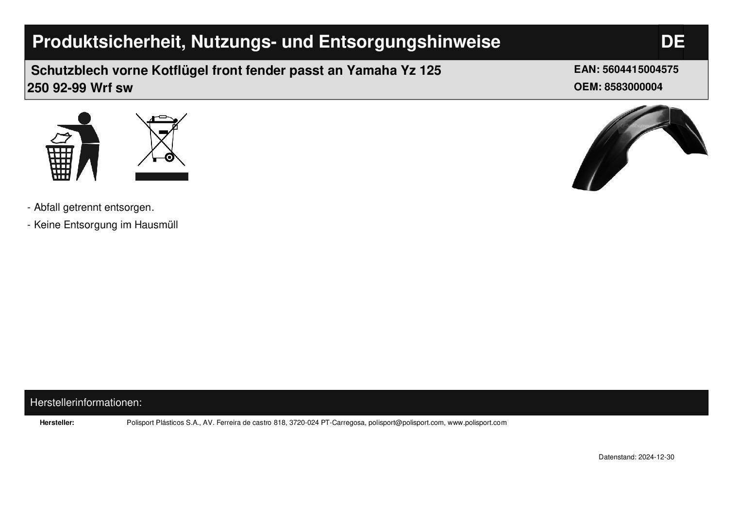 Polisport Schutzblech vorne Kotflügel front fender passt an Yamaha Yz 125 250 92-99 Wrf sw