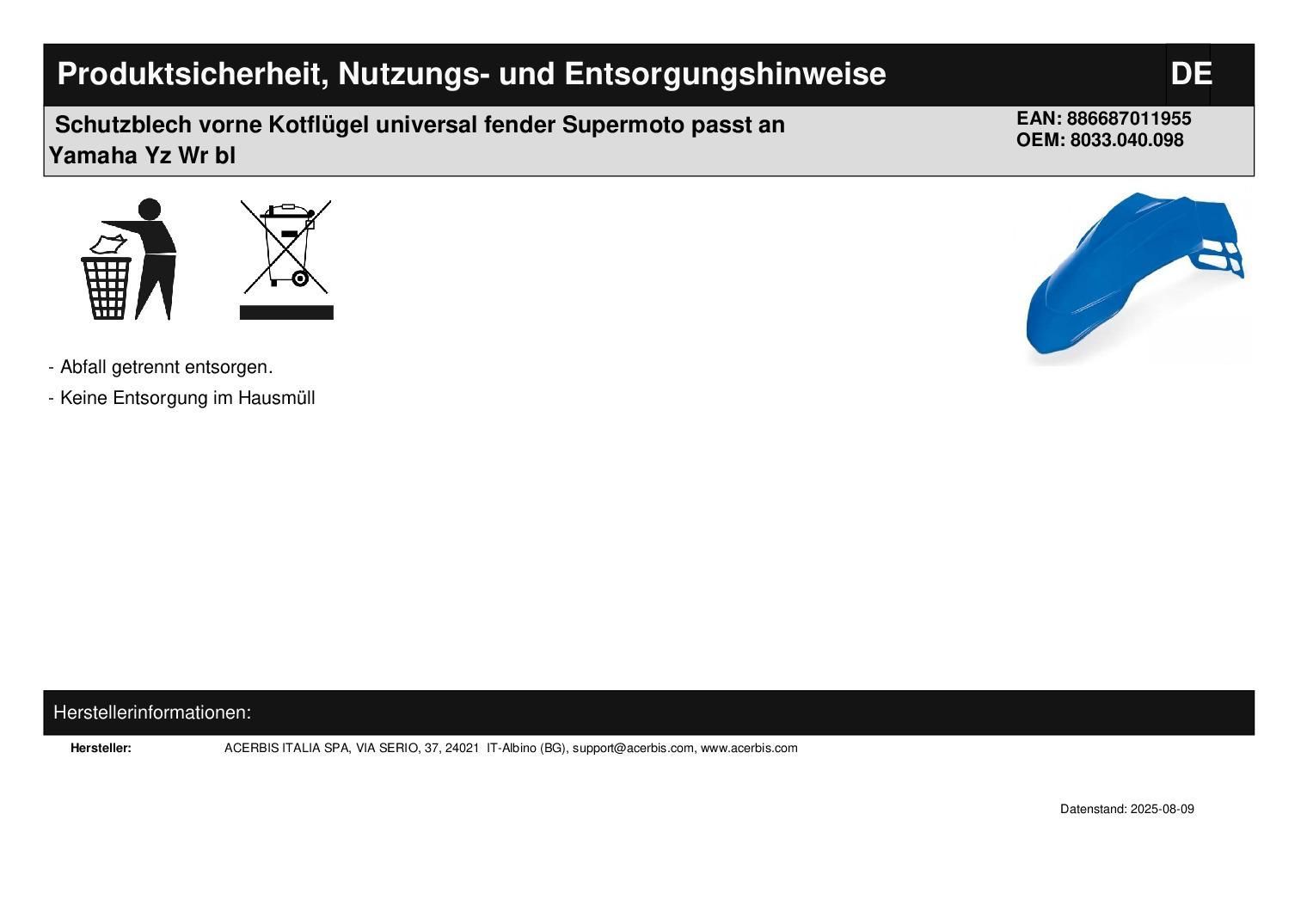 Acerbis Schutzblech vorne Kotflügel universal fender Supermoto passt an Yamaha Yz Wr bl