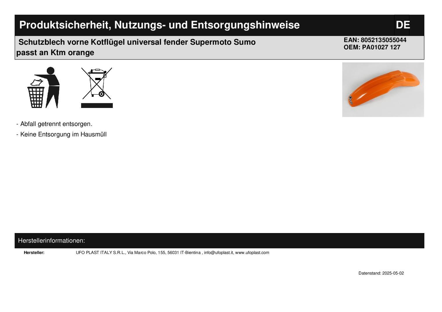 Schutzblech vorne Kotflügel universal fender Supermoto Sumo passt an Ktm orange