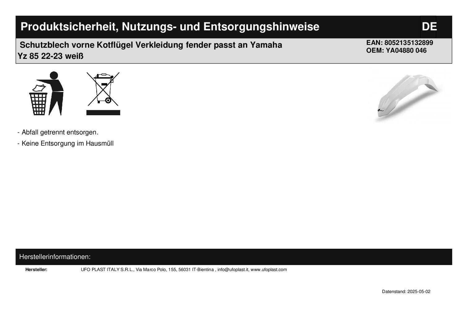Schutzblech vorne Kotflügel Verkleidung fender passt an Yamaha Yz 85 22-23 weiß