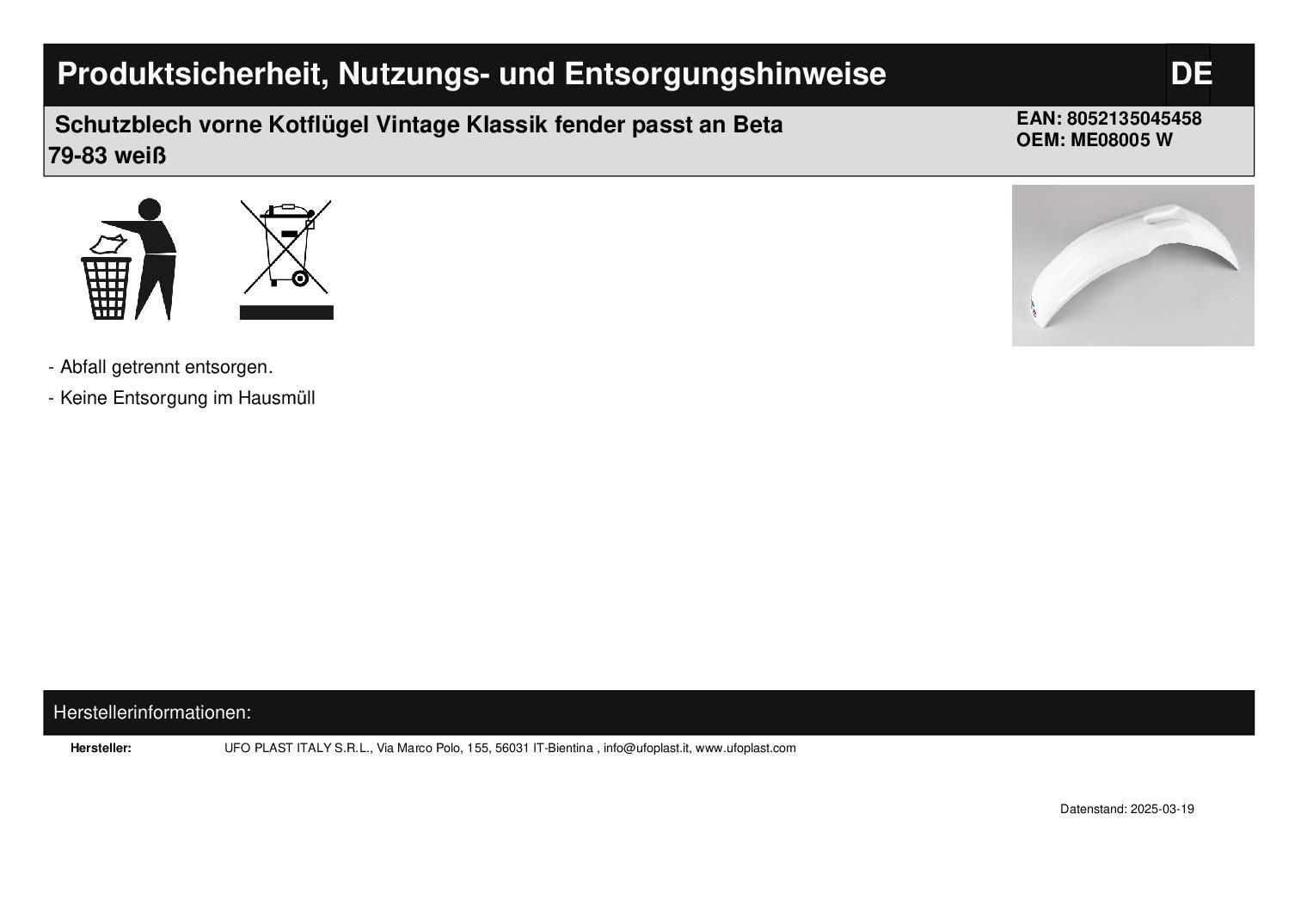 Schutzblech vorne Kotflügel Vintage Klassik fender passt an Beta 79-83 weiß