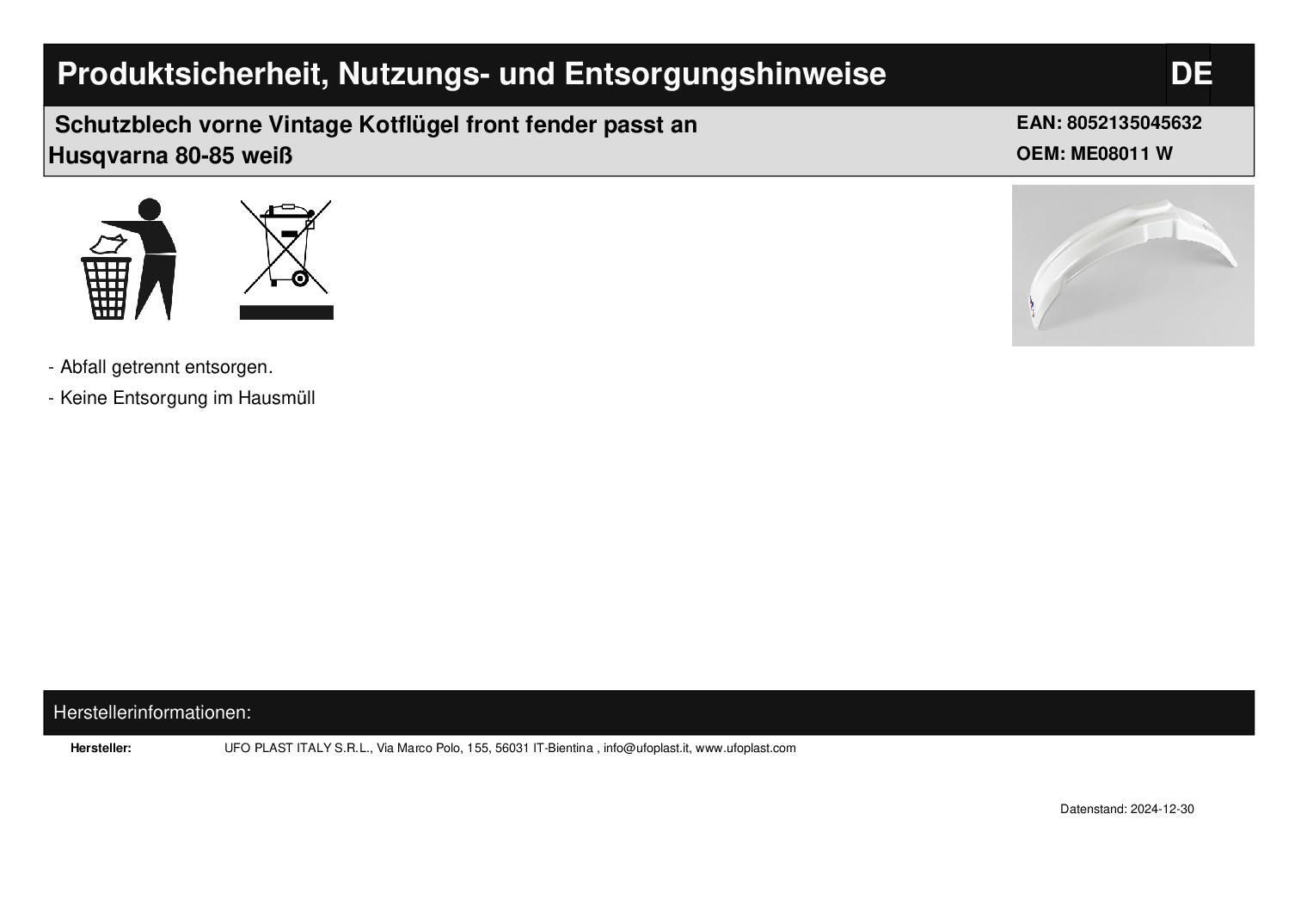 Schutzblech vorne Vintage Kotflügel front fender passt an Husqvarna 80-85 weiß