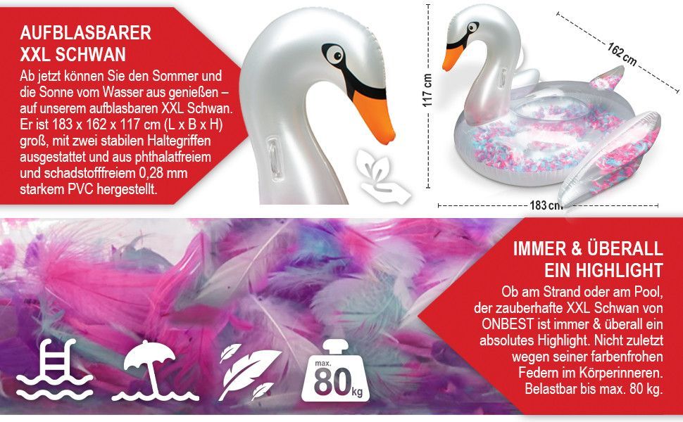Poolspielzeug »Schwan« Der aufblasbare XXL Schwan ist das Highlight an Pool und Strand für jede Menge Spaß im Wasser. Das zauberhafte Schwan-Design mit pinken, weißen, blauen und violetten Federn macht den ONBEST Schwan zum Blickfang und sorgt bei Groß und Klein für Begeisterung auf der nächsten Poo