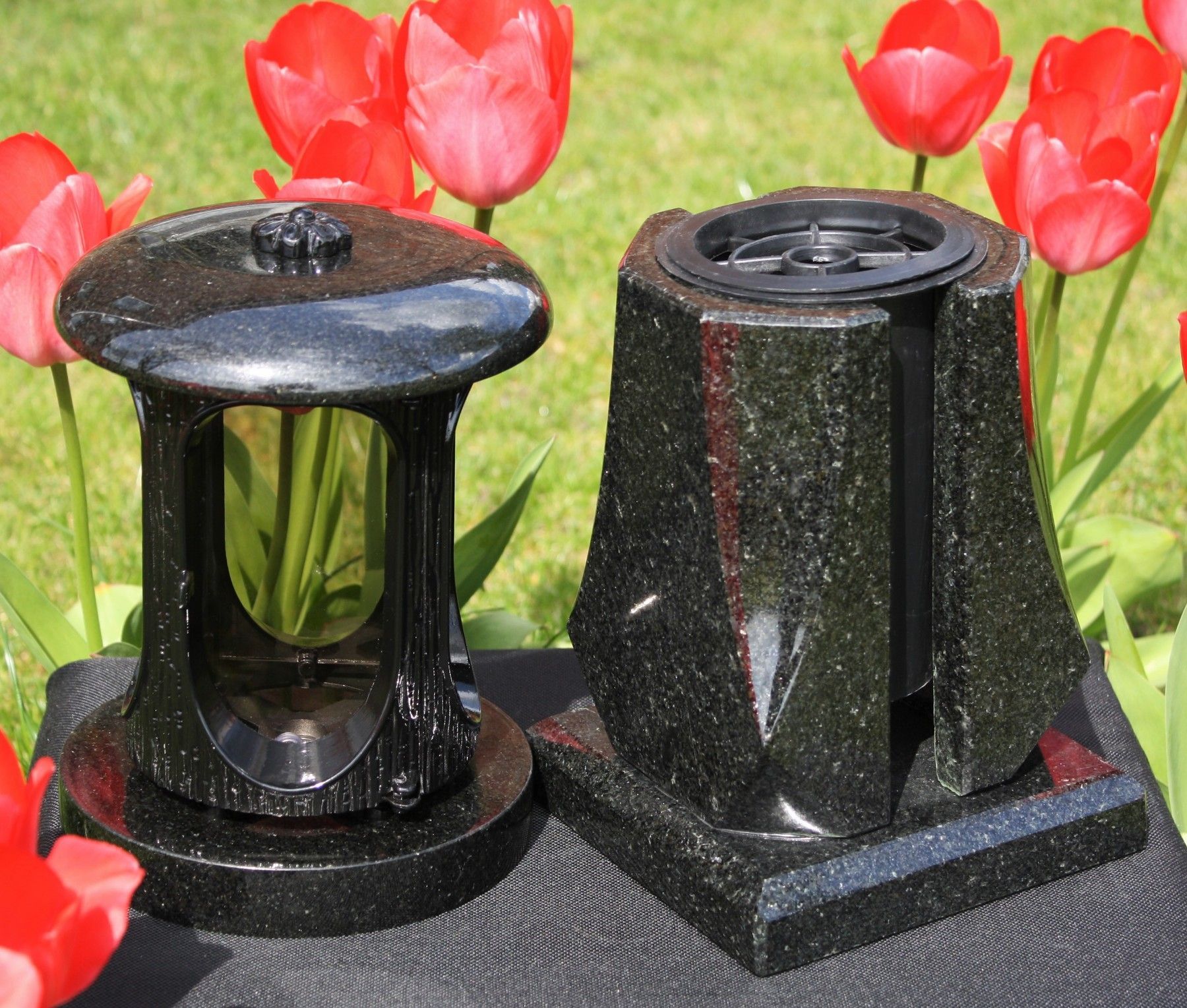 schwarze Grablaterne mit stilvoller Vase aus Granit Grab-Lampe Grabvase Blumenvase