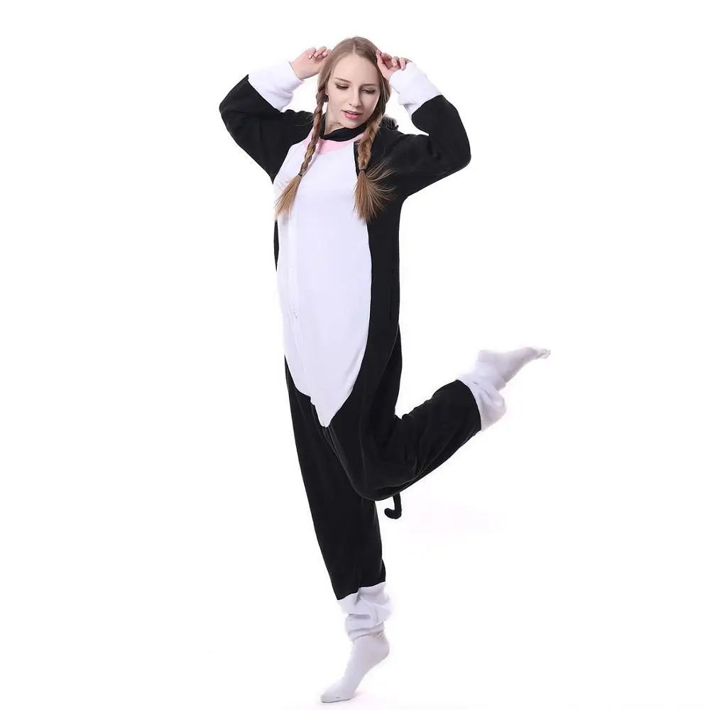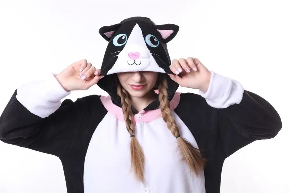 Schwarze Katze Onesie Erwachsene Damen Tier Cosplay Pyjamas Plusch Winter Halloween