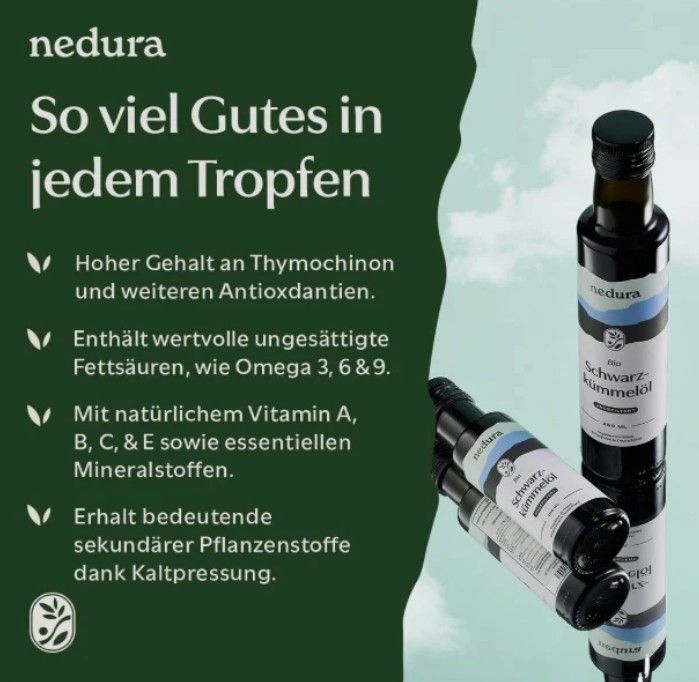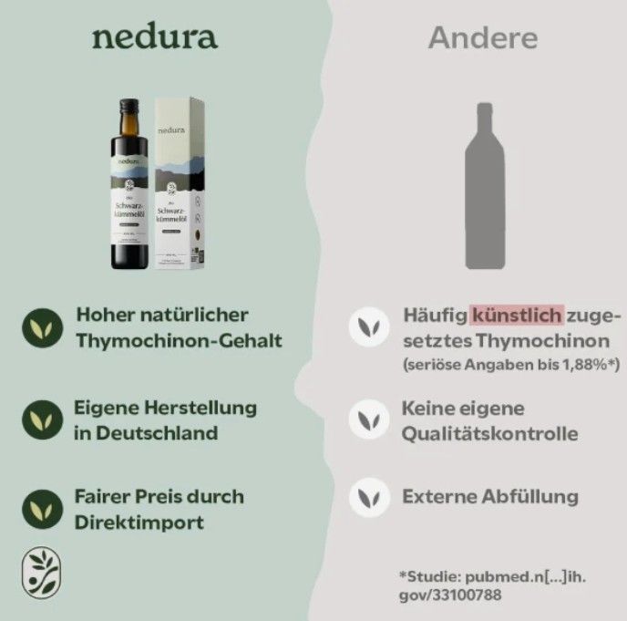 nedura® Schwarzkümmelöl BIO kaltgepresst (ungefiltert) 500ml – mit hohem Thymochinongehalt, BIO-Zertifiziert & 100% rein - täglich frisch & schonend gepresst - aus eigener Manufaktur Manufacturer's product description Produktinformation Previous page Next page