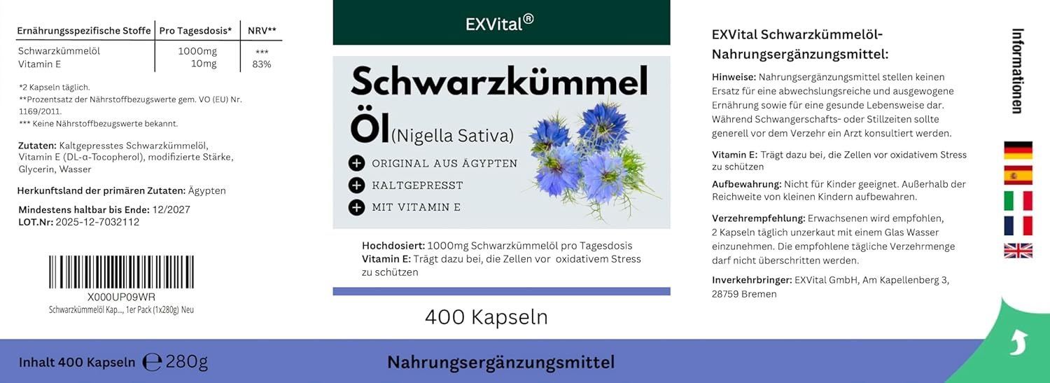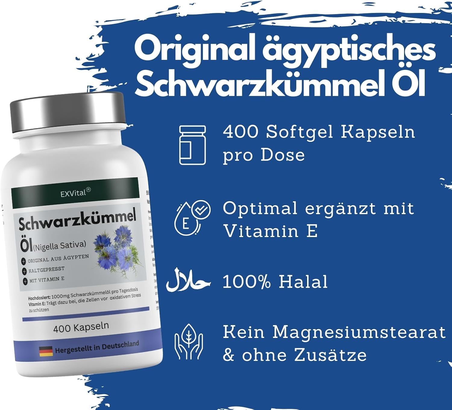 Schwarzkümmelöl Kapseln, 1000 mg, kaltgepresst, ägyptisch, Natur, von EXVital