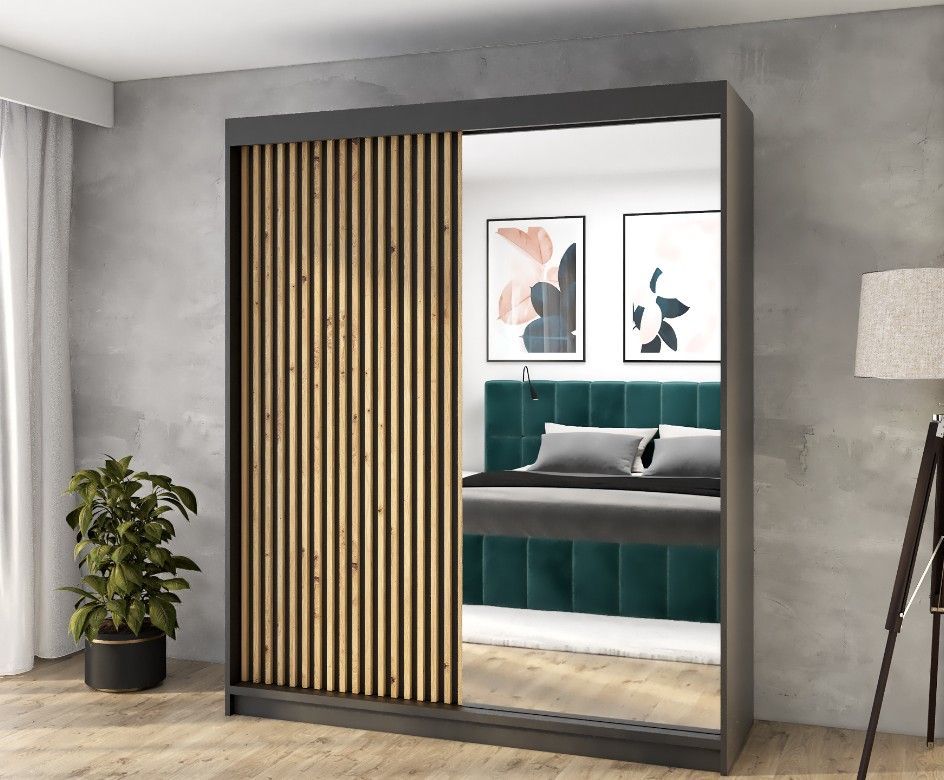 Schwebetürenschrank, 2-türig Schrank mit Spiegel und 3D-Lamellen- MIT 160 cm