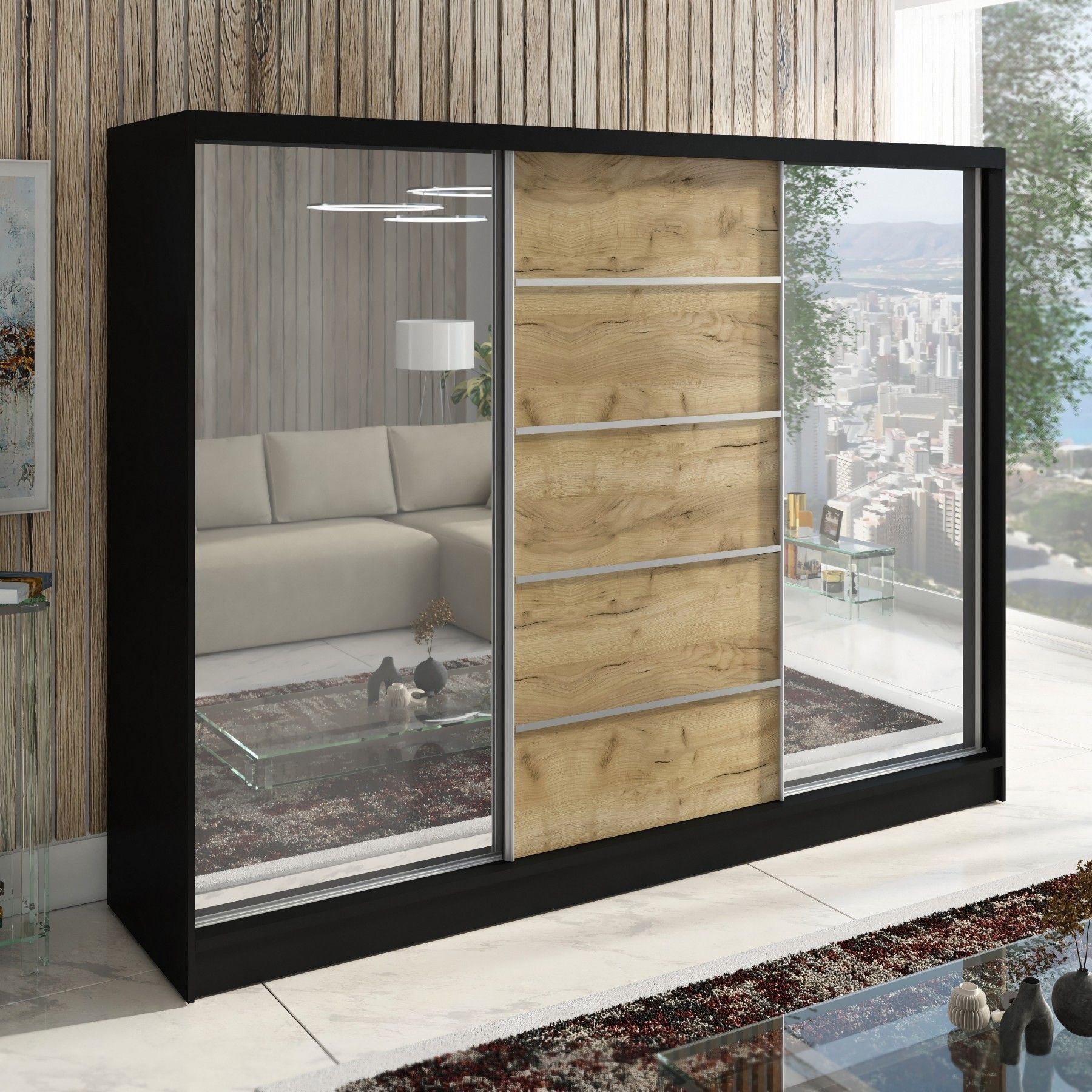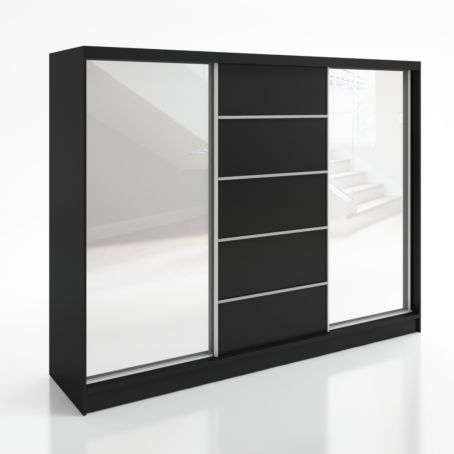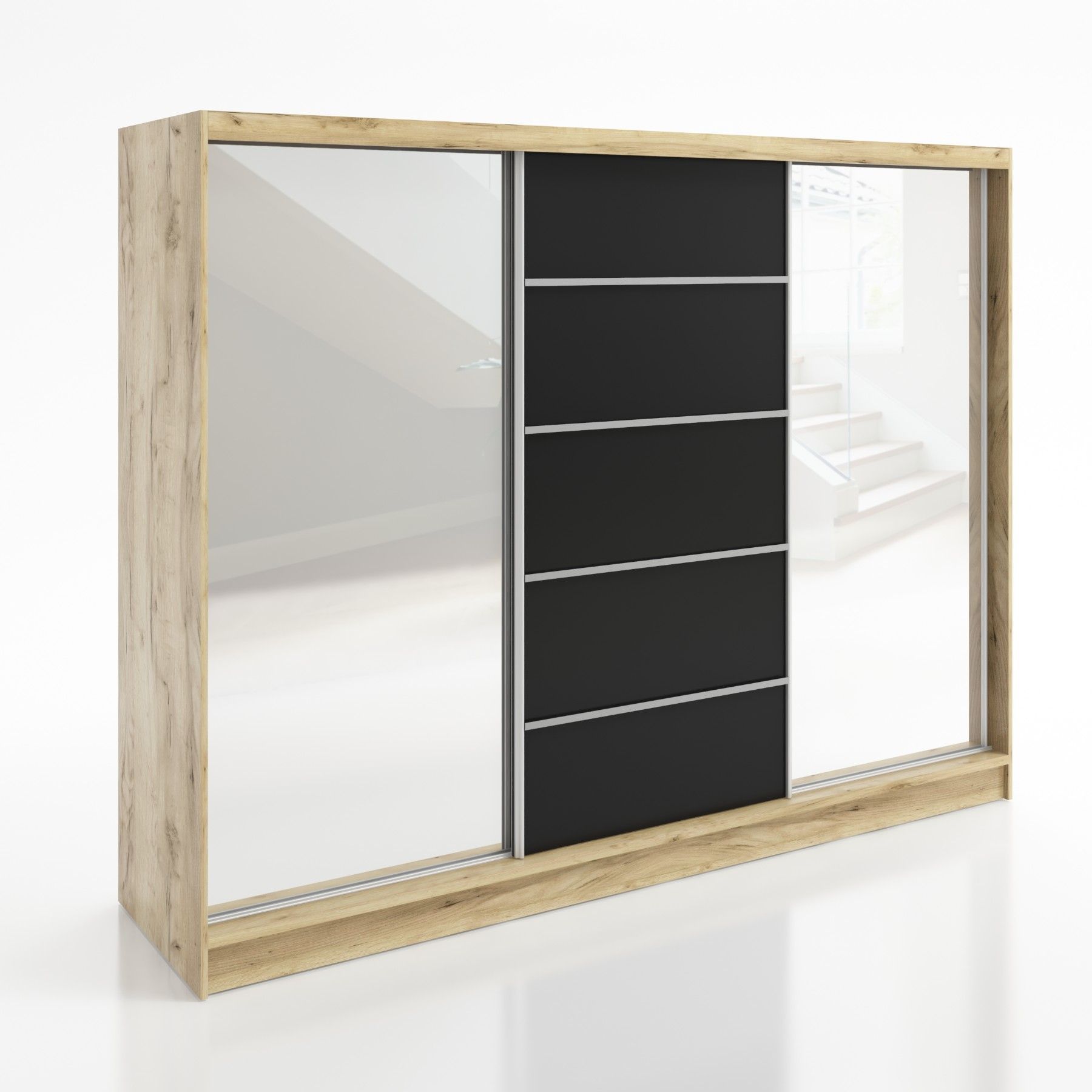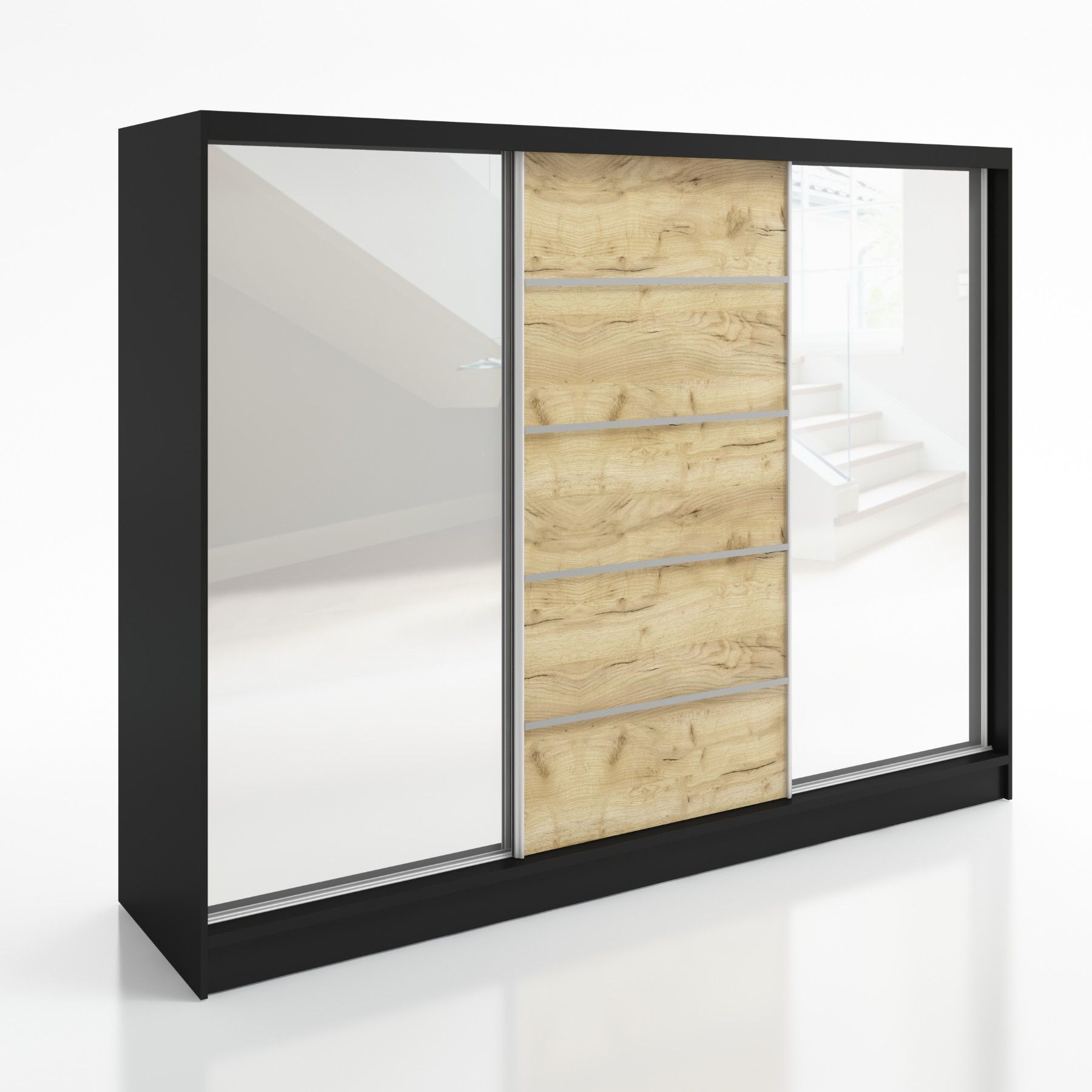 Schwebetürenschrank TARO , 3-türig Schrank 200 cm mit 4 Schubladen und Spiegel