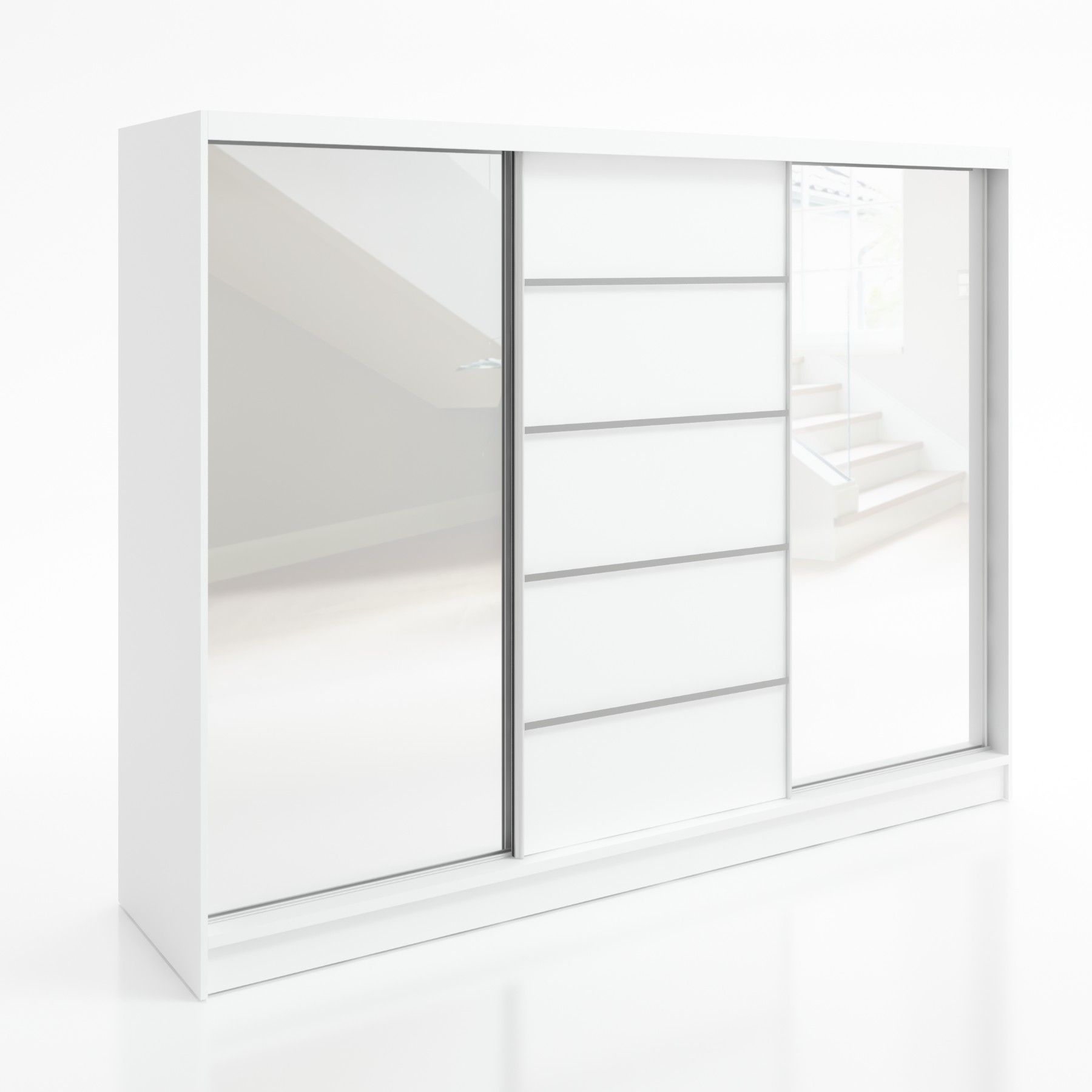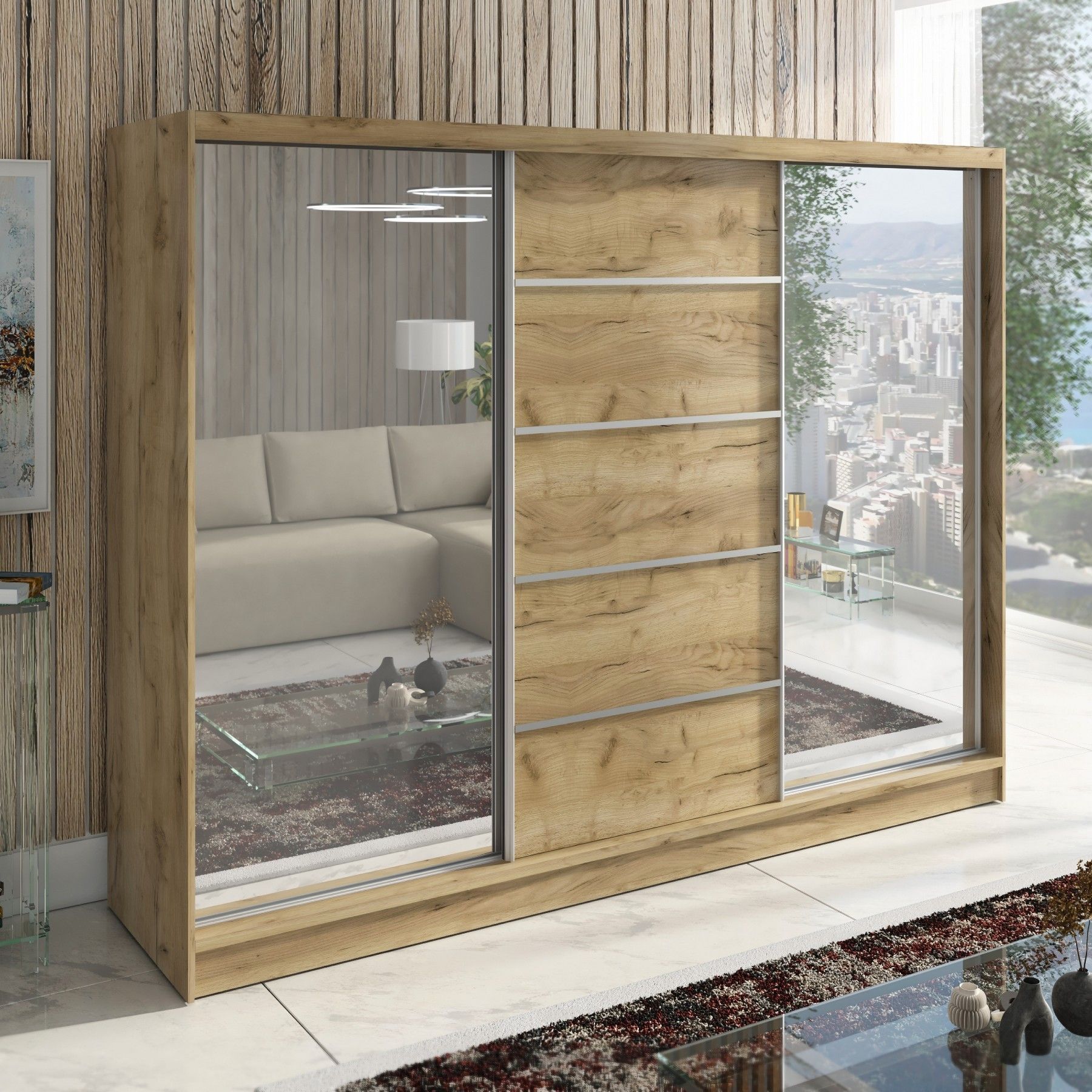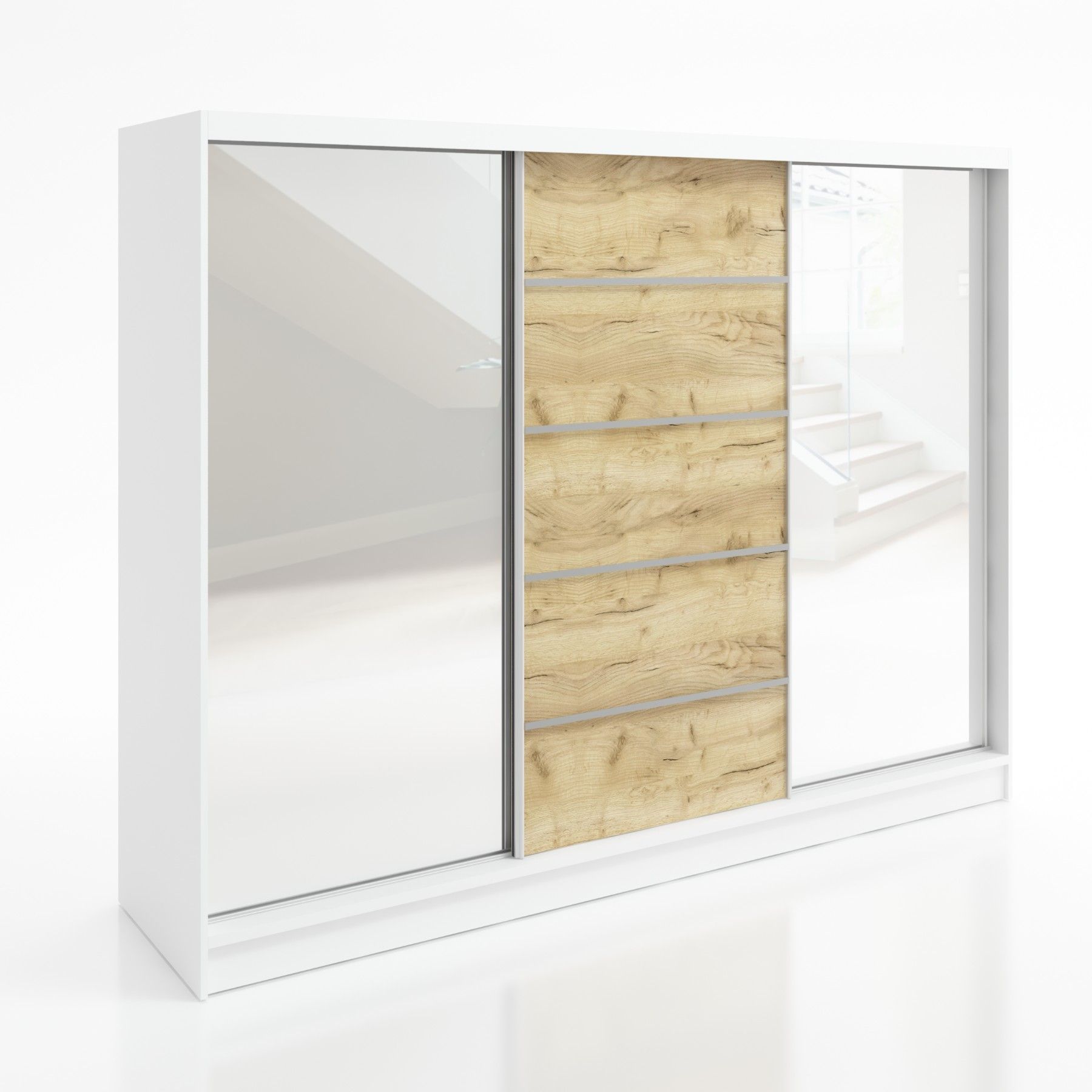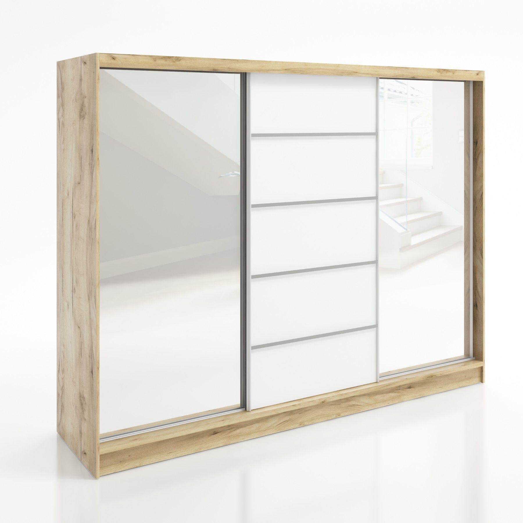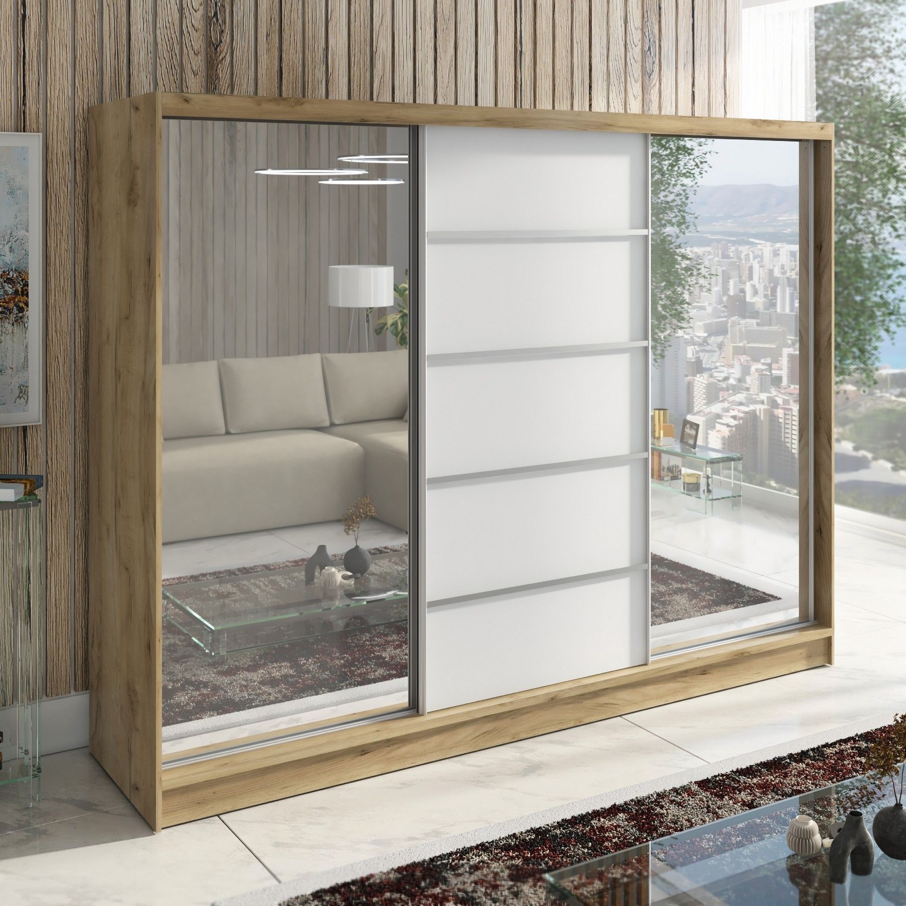Schwebetürenschrank TARO , 3-türig Schrank 200 cm mit 4 Schubladen und Spiegel