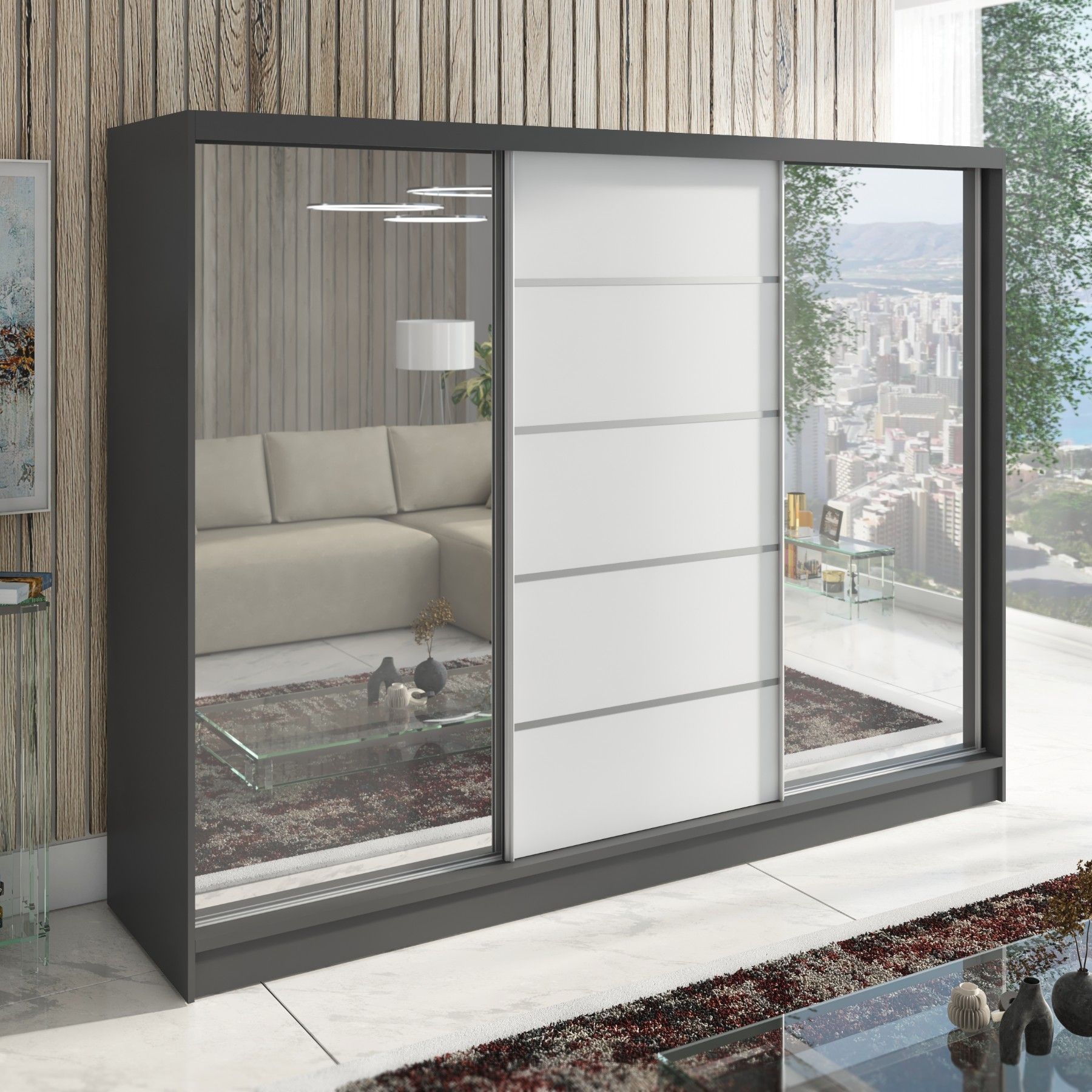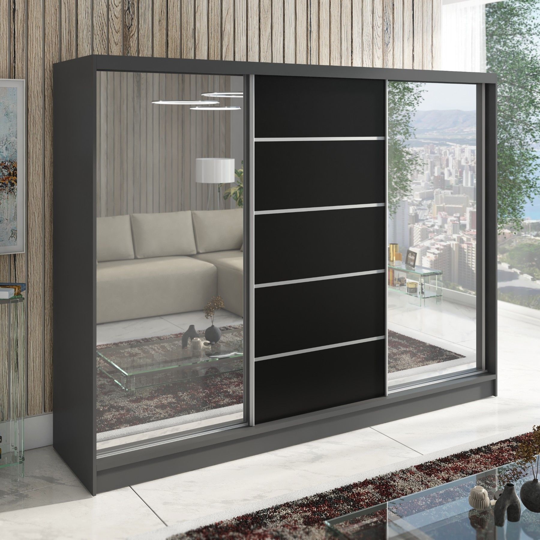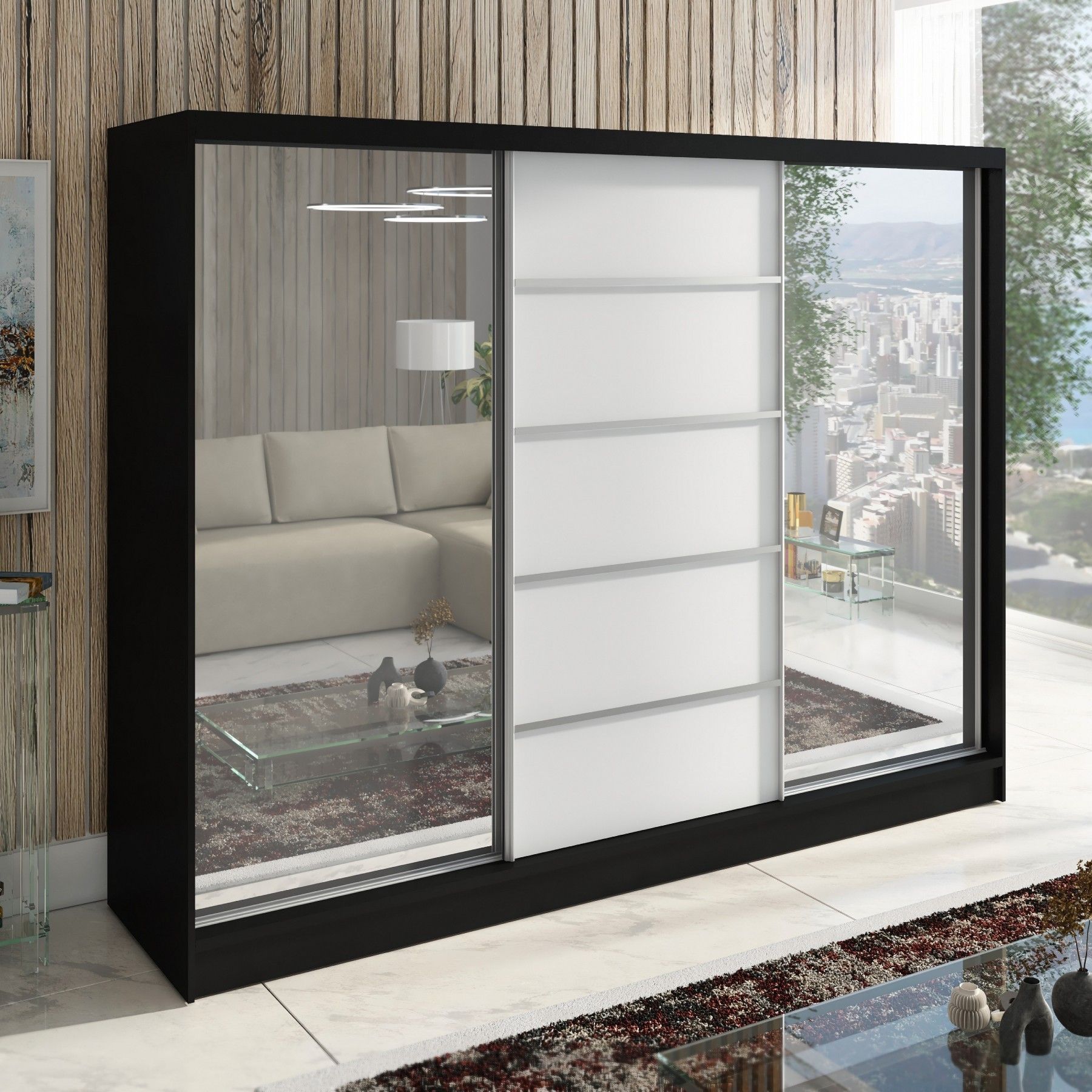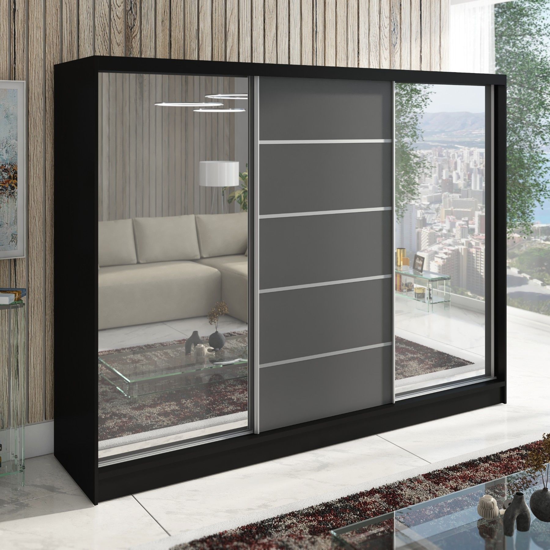 Schwebetürenschrank TOP , 3-türig Schrank 200 cm mit 4 Schubladen und Spiegel