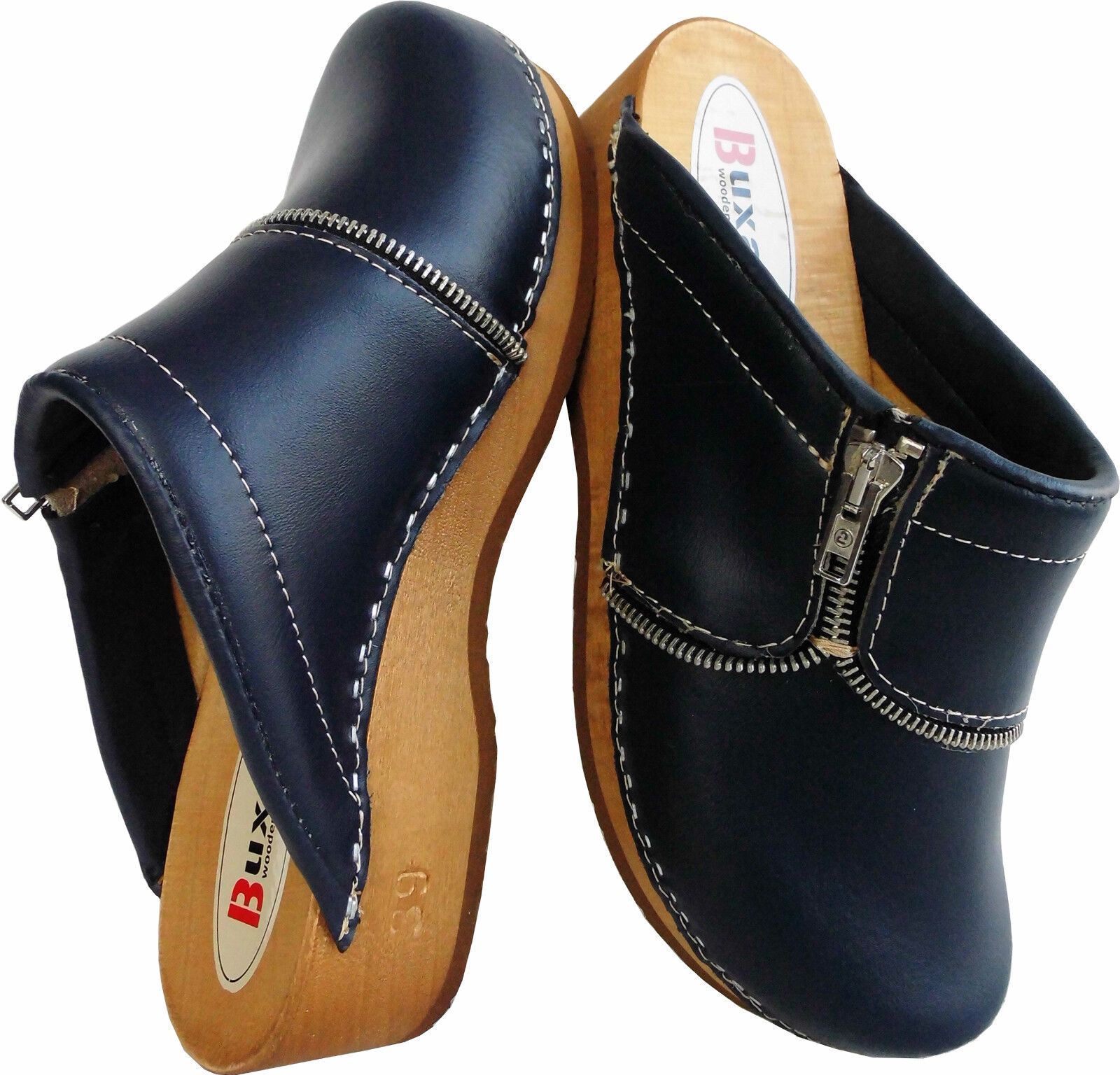 Schweden HOLZ CLOGS Pantolette *** Gr. 37 - DUNKEL BLAU *** *** Gefertigt aus Holz; *** Obermaterial - Naturleder *** Anatomische geformte Sohlen aus Naturholz *** Aussensohle - aus grob profilierter Gummi (rutschfest) *** Absatzhöhe: 5,00 cm *** Diese schöne Clogs sind elegant und modern mit dekora