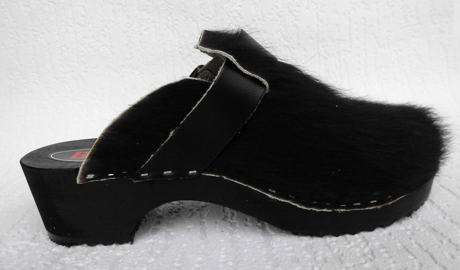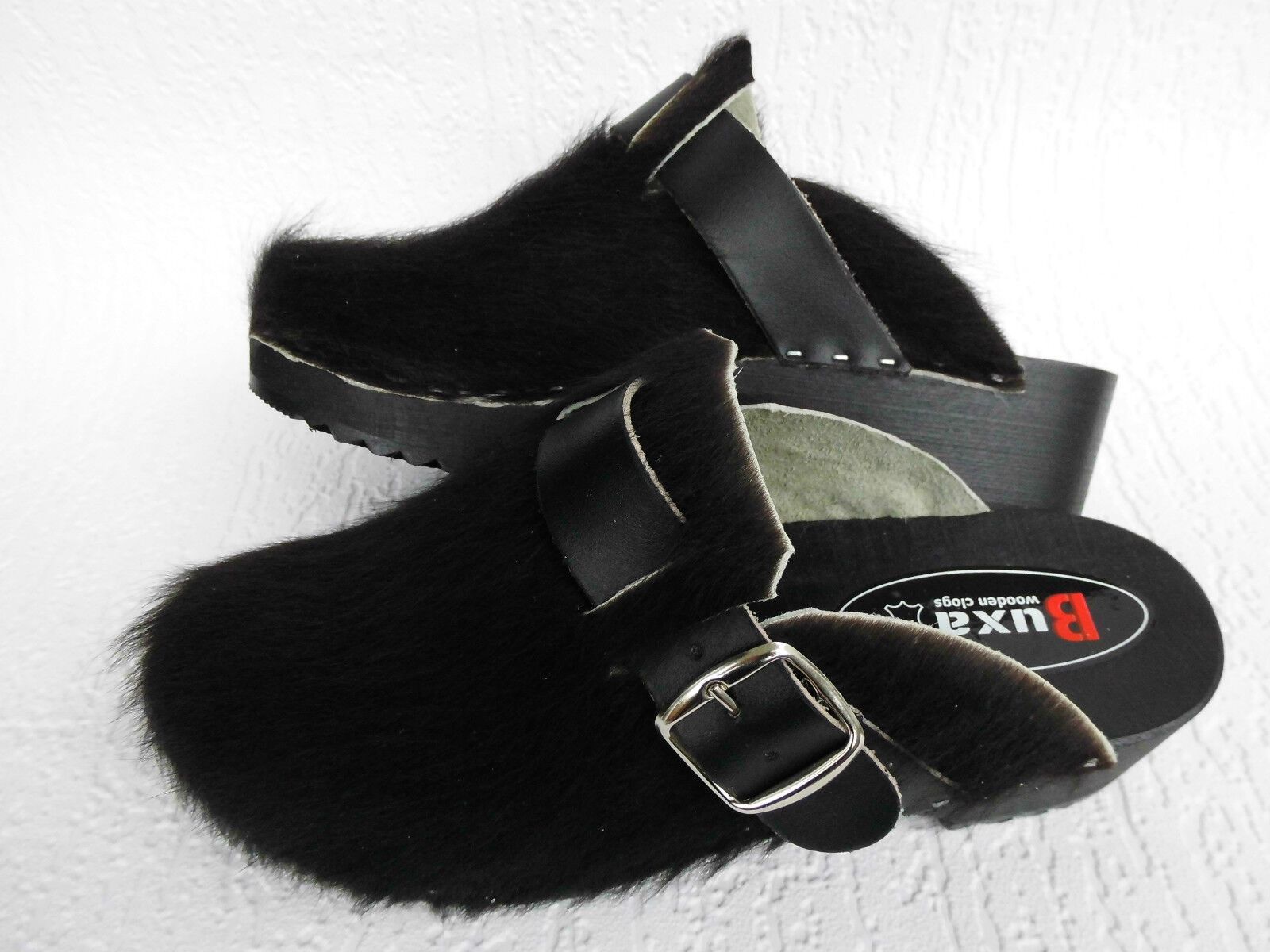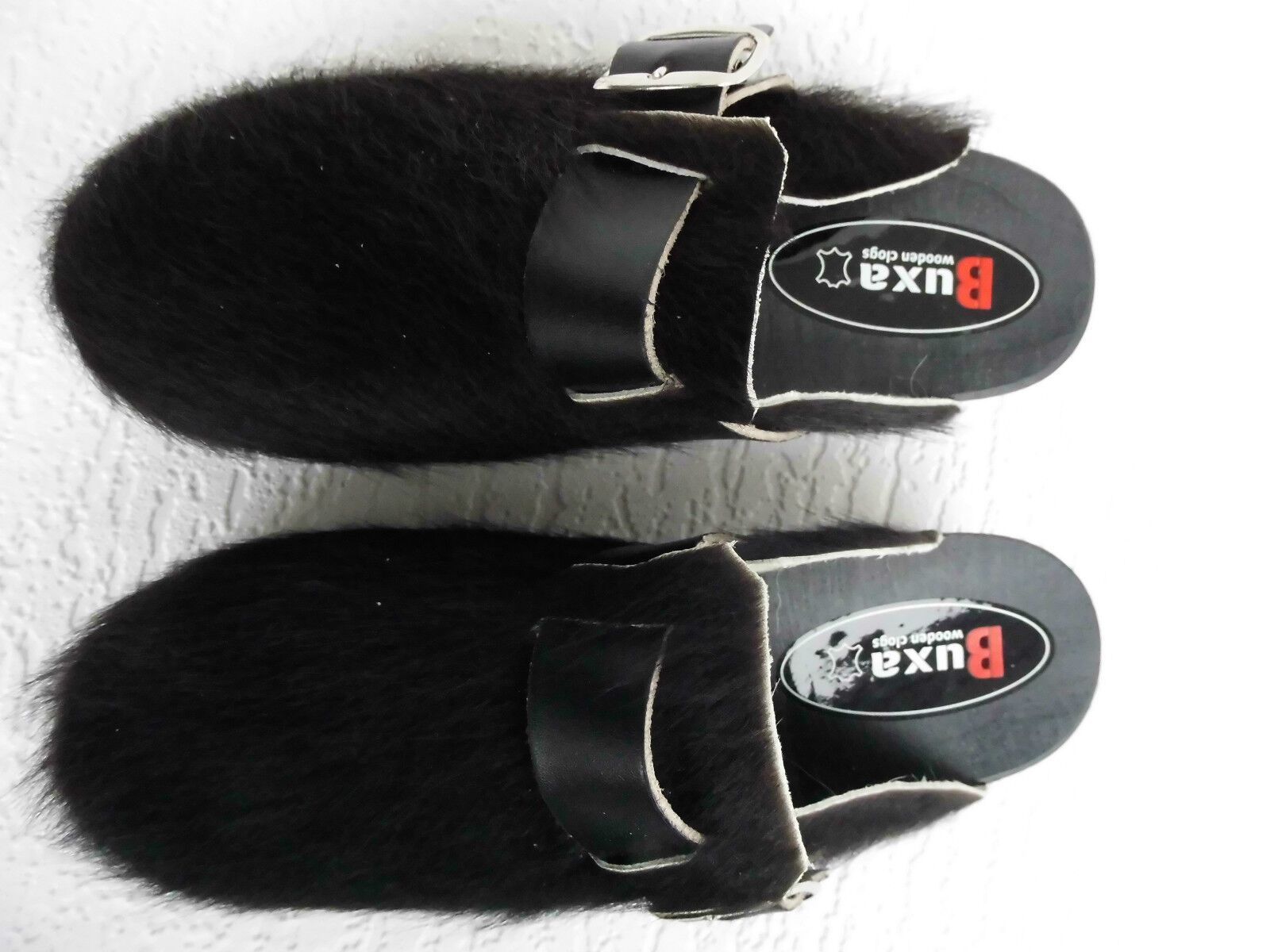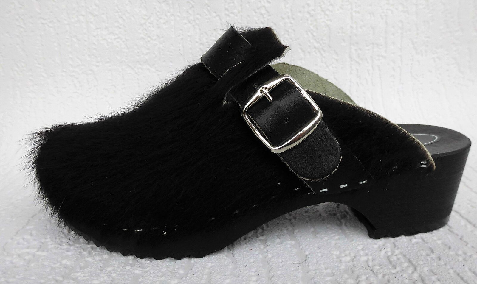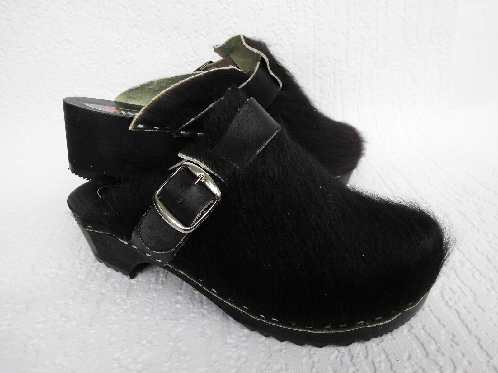 Schweden HOLZ CLOGS Pantolette Gr. 45 SCHWARZ *** Gefertigt aus Holz; *** Obermaterial - Naturleder Kuhfell *** Anatomische geformte Sohlen aus Naturholz *** Aussensohle - aus grob profilierter Gummi (rutschfest) *** Absatzhöhe: 4,5 cm *** Neu *** Sehr hochwertige Verarbeitung *** Ein reines Naturpr