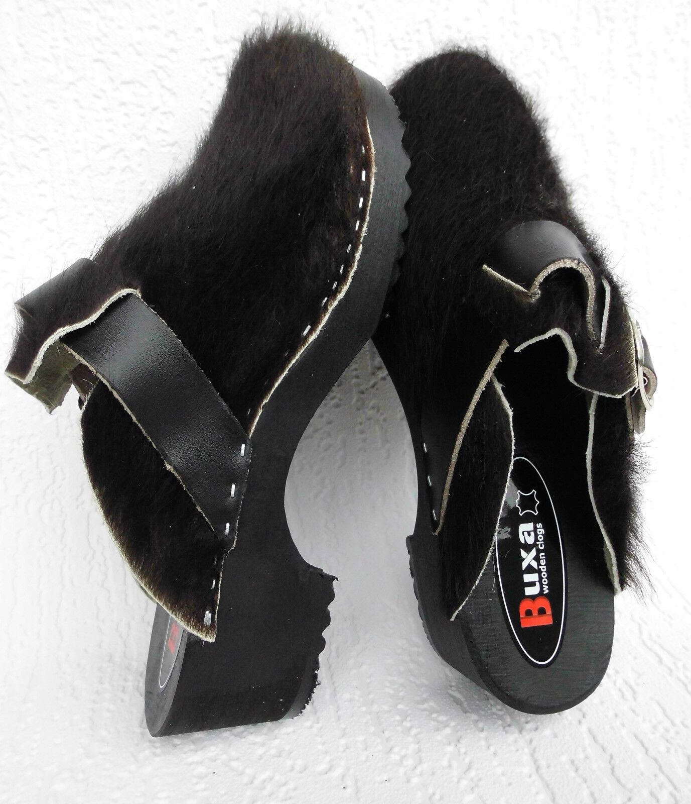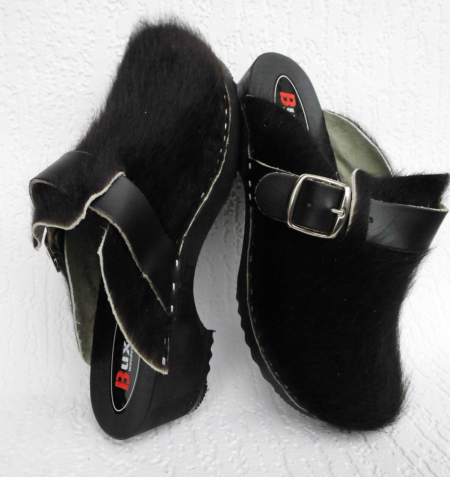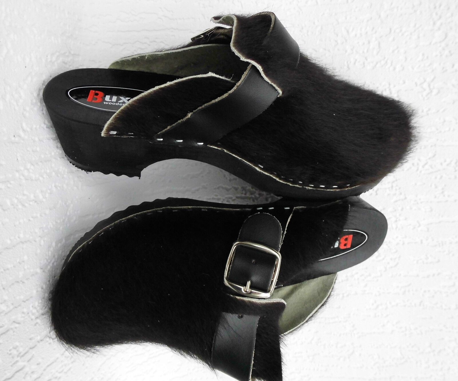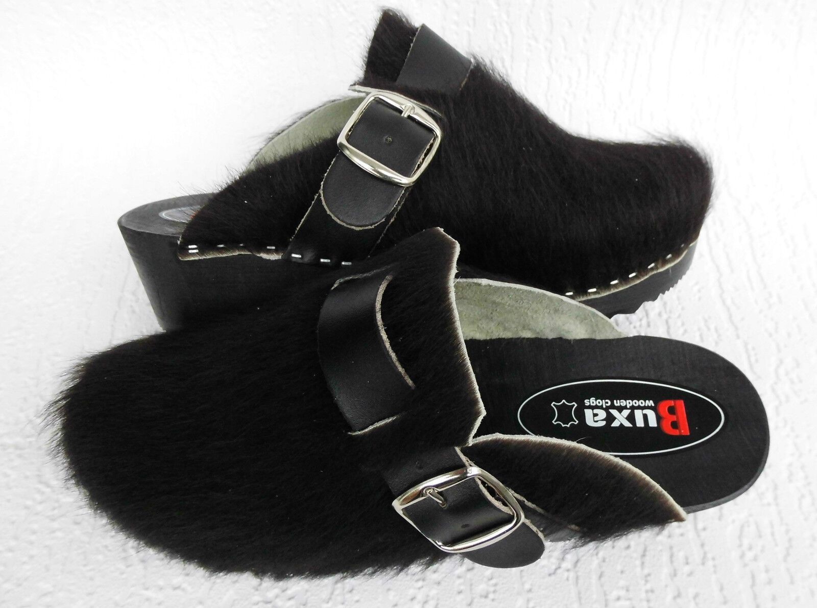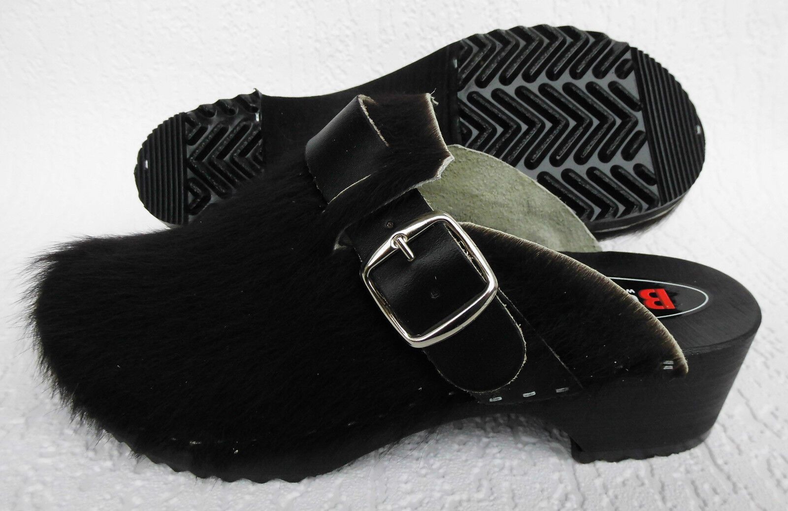 Schweden HOLZ CLOGS Pantolette Gr. 45 SCHWARZ *** Gefertigt aus Holz; *** Obermaterial - Naturleder Kuhfell *** Anatomische geformte Sohlen aus Naturholz *** Aussensohle - aus grob profilierter Gummi (rutschfest) *** Absatzhöhe: 4,5 cm *** Neu *** Sehr hochwertige Verarbeitung *** Ein reines Naturpr