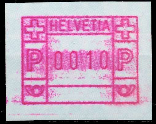 SCHWEIZ AUTOMATENMARKEN A3 Nr 3yavI 0010 postfrisch Automatenmarke (ATM) 3. Ausgabe, Papier phosphoreszierend mit violetten Fasern, Unterdruck Type I 1.90€ incl. MwSt: Differenzbesteuert zzgl. Versandkosten Bestell-Nr.: 679662 Katalog-Nr: MICHEL (3 yavI 0010) Katalogpreis: 5 EUR Qualität: Norma
