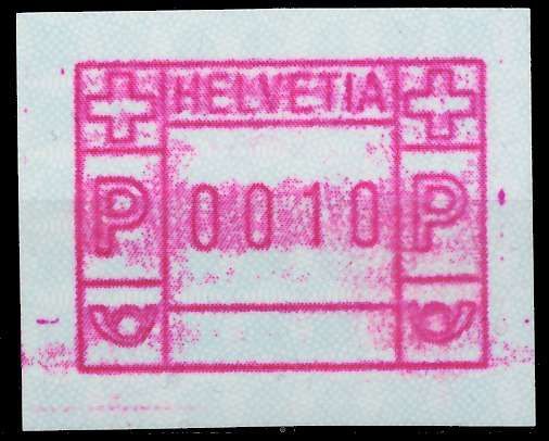 SCHWEIZ AUTOMATENMARKEN A3 Nr 3yavI 0010 postfrisch Automatenmarke (ATM) 3. Ausgabe, Papier phosphoreszierend mit violetten Fasern, Unterdruck Type I 1.90€ incl. MwSt: Differenzbesteuert zzgl. Versandkosten Bestell-Nr.: 679666 Katalog-Nr: MICHEL (3 yavI 0010) Katalogpreis: 5 EUR Qualität: Norma