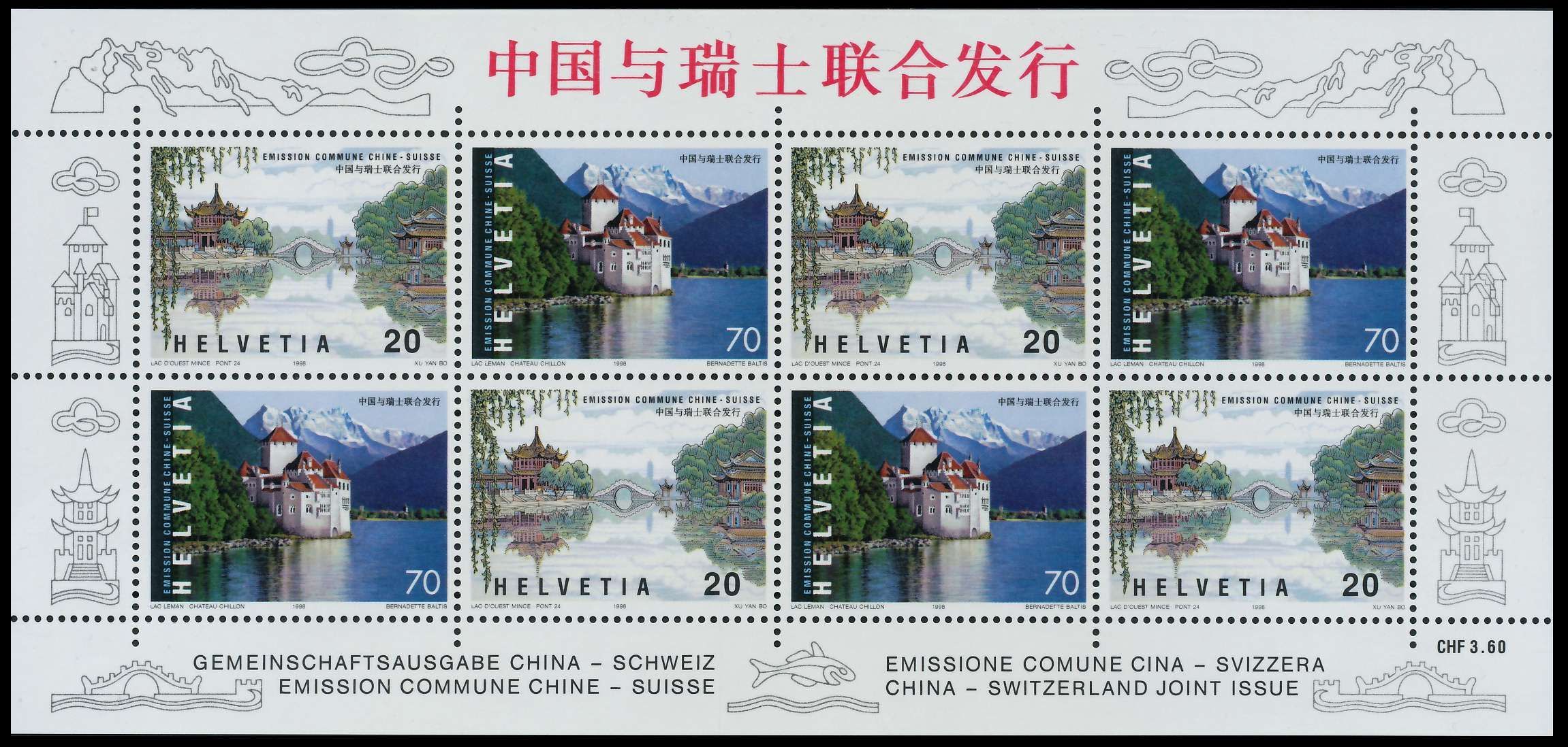 SCHWEIZ BLOCK KLEINBOGEN 1990-1999 Nr 1667-1668 20 und 70 C Wert aus der Ausgabe Schweizerisch-Chinesische Freundschaft, kompletter Zusammendruck-Kleinbogen mit 8 Marken (MichelNr.: ) 4.55€ incl. MwSt: Differenzbesteuert zzgl. Versandkosten Bestell-Nr.: 657B5E Katalog-Nr: MICHEL (1667 - 1668) K