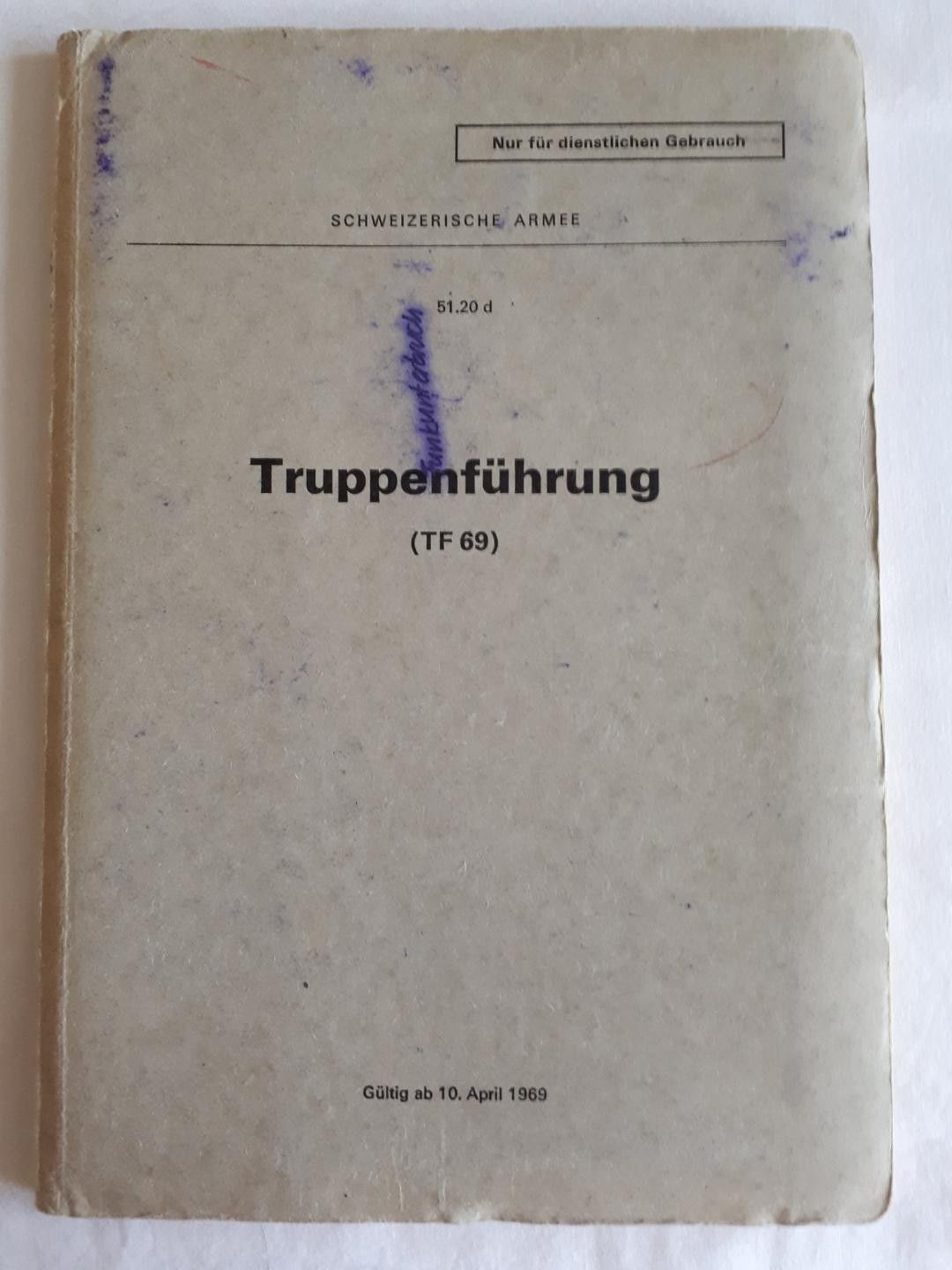 Schweizer Armee - 51.20 d Truppenführung TF 69 R. * gültig ab 10.April 1969 * Seitenanzahl: 67 Zustand: gut - gebraucht mit kleinen Gebrauchsspuren (Seiten sind etwas gebräunt, auch ist der Name eines Vorbesitzers auf der ersten Seite vorhanden)