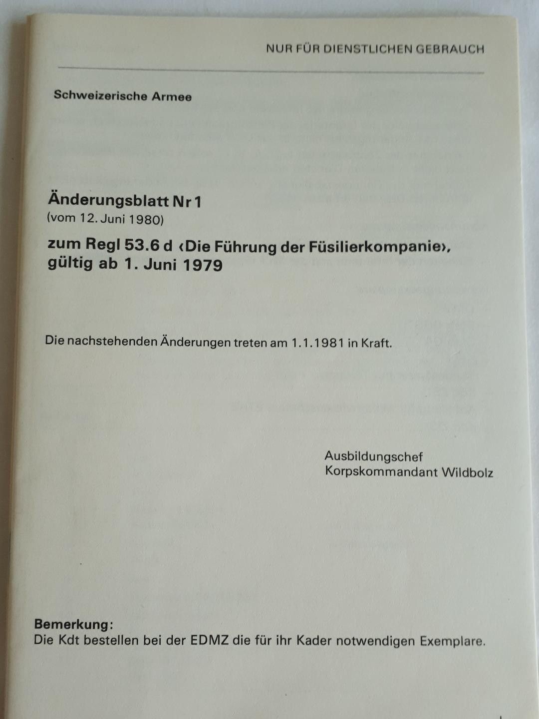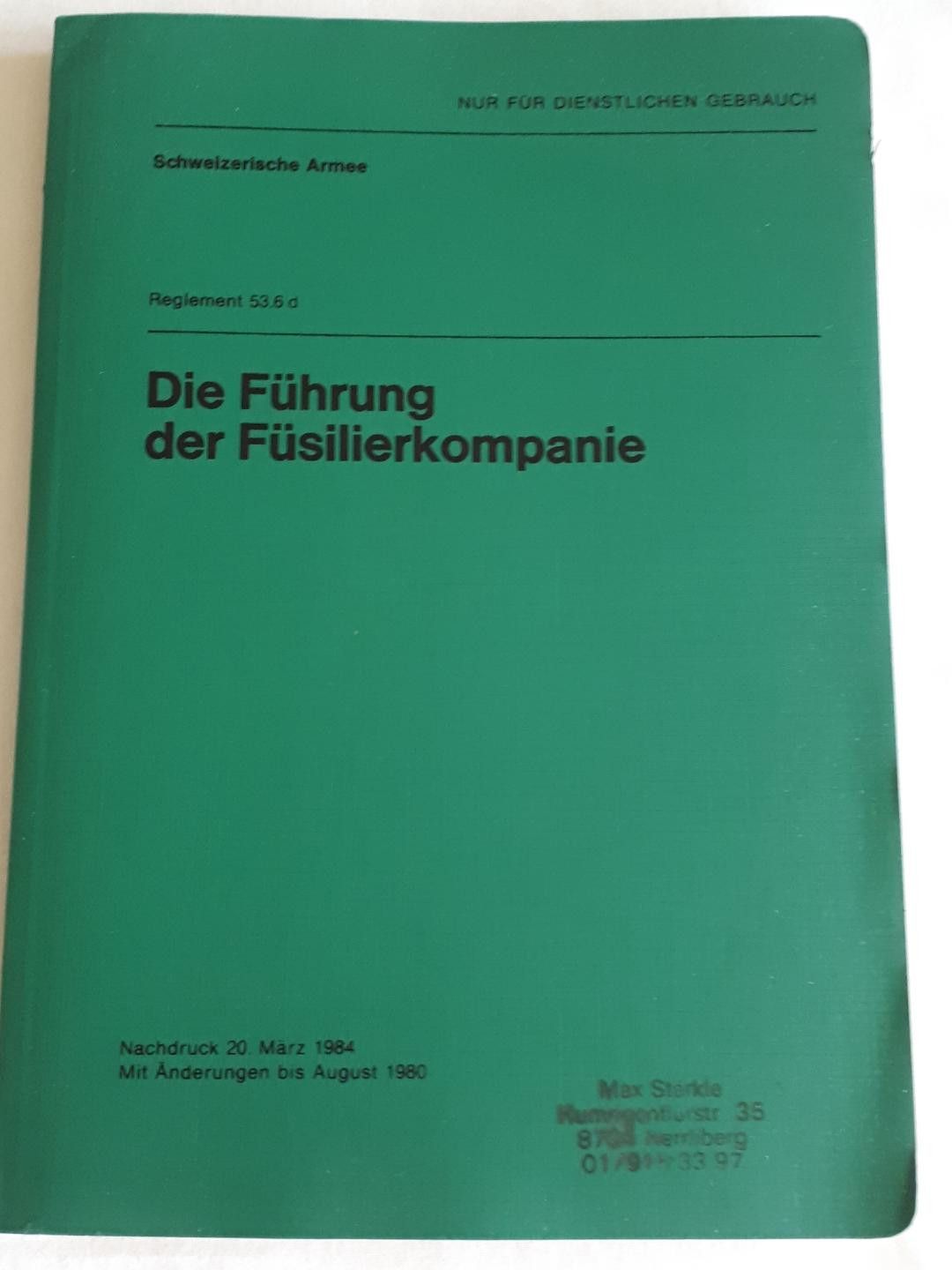 Schweizer Armee - Die Führung des Füsilierbataillon R. * Nachdruck 20.3.1984 - mit Änderungen bis 8.1980 * Seitenanzahl: 146 Zustand: gut - gebraucht mit kleineren Gebrauchsspuren (mehrere Stempelungen eines Vorbesitzers kommen vor)