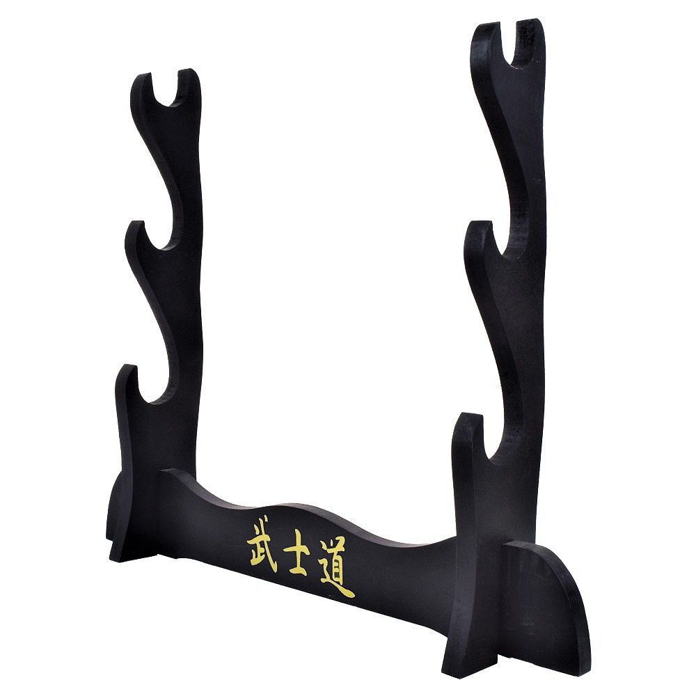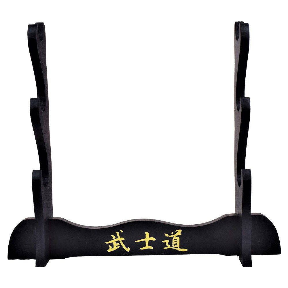 Schwertständer schwarz matt für 3 Schwerter kaufen, Tischständer mit goldenen asiatischen Schriftzeichen.