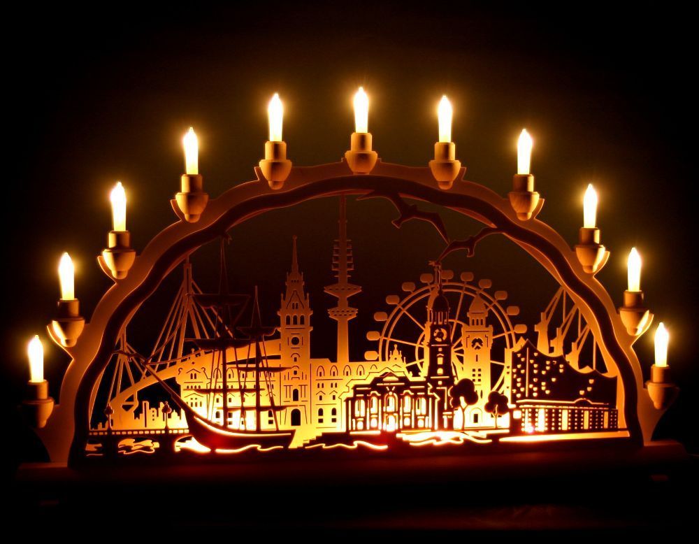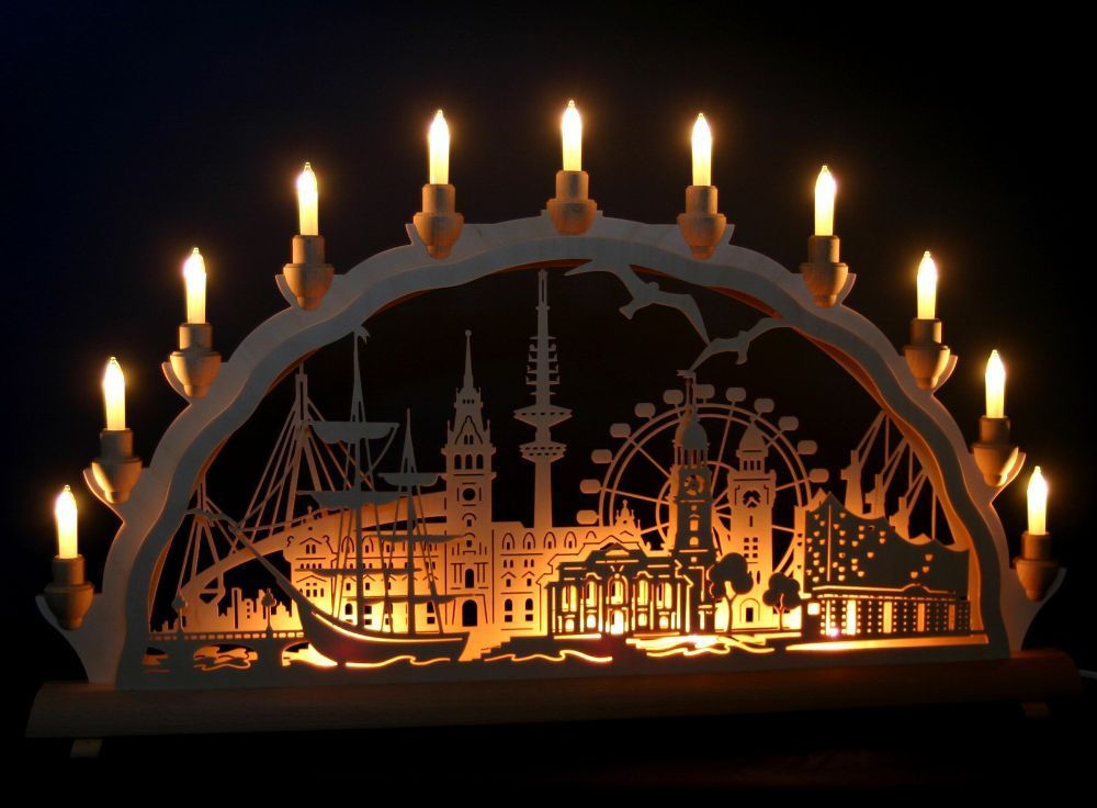 Schwibbogen Hamburg 68cm Stadtansicht Dom Landungsbrücken Lichterbogen Erzgebirge