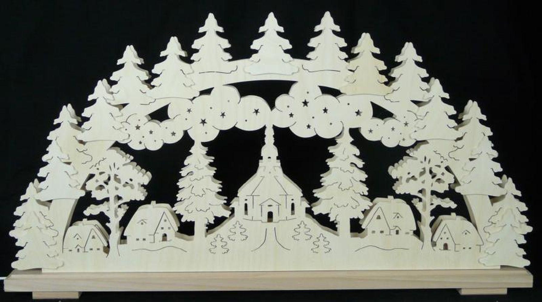 Schwibbogen mit Dorf Kirche Wald und Beleuchtung BxHxT 70x37x7cm NEU Lichterbogen