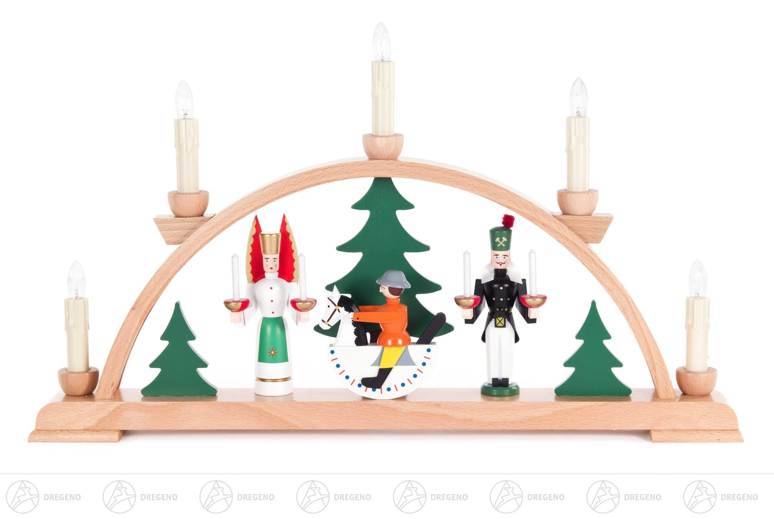 Schwibbogen mit Engel, Bergmann und Reiterlein, farbig, elektrisch beleuchtet
