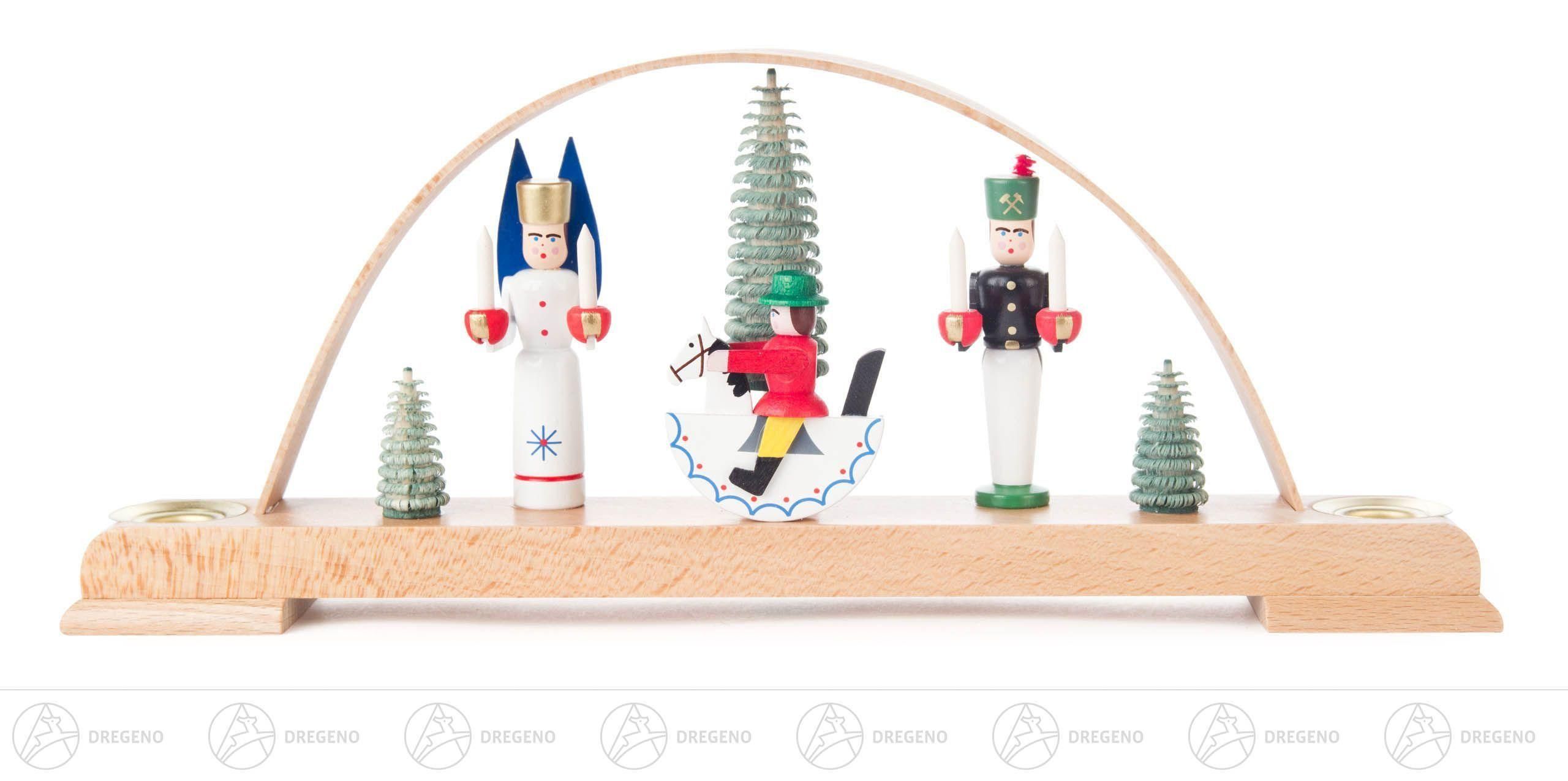 Schwibbogen mit Engel, Bergmann und Reiterlein, farbig, für Kerzen d=14mm