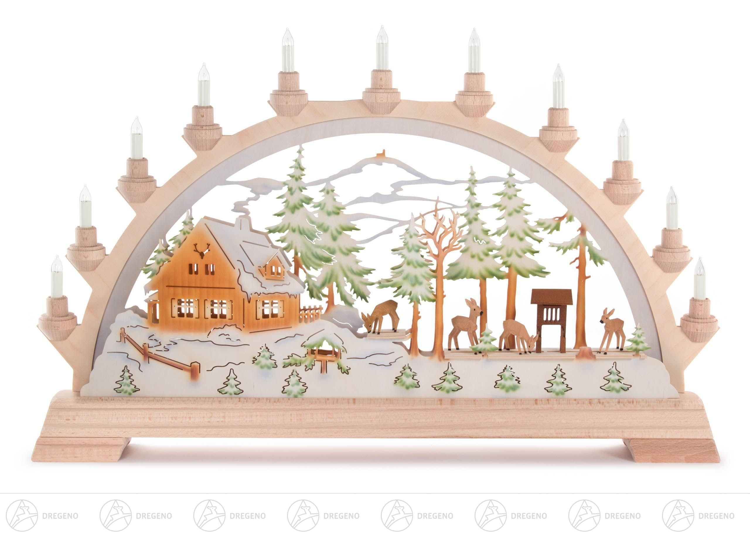 Schwibbogen mit Forsthaus u. Rehen farbig elektrisch beleuchtet 63 cmx40 cmx6 cm