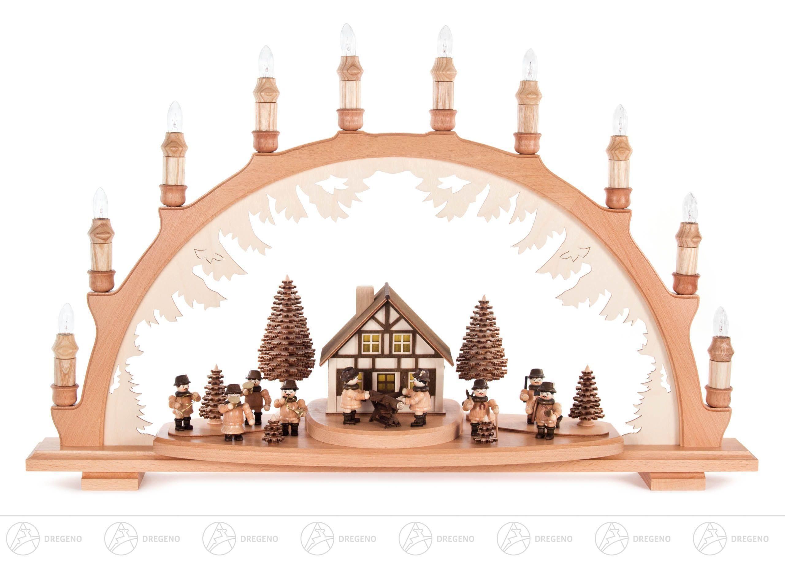 Schwibbogen mit Forsthaus und Waldleuten, elekt. beleuchtet, innenbel. Gebäude
