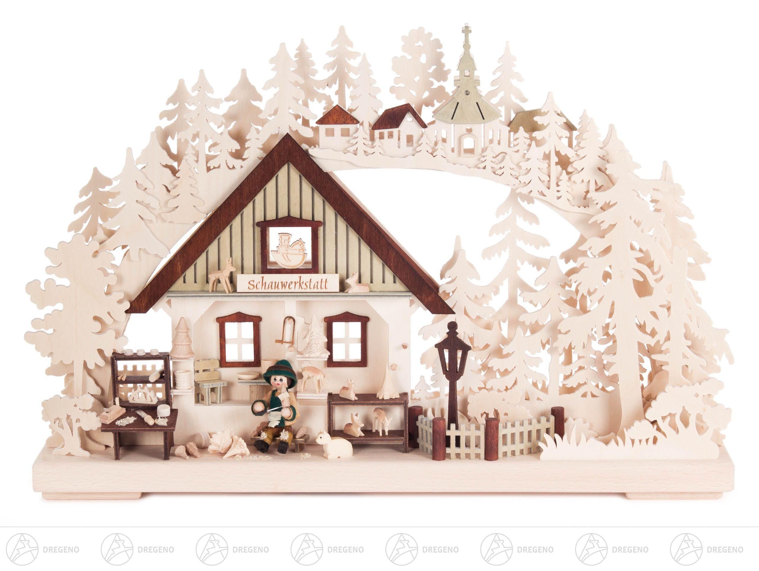 Schwibbogen "Schauwerkstatt" mit Schnitzer klein, indirekt elektrisch beleuchtet