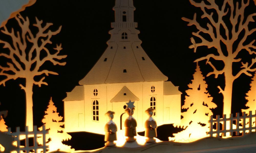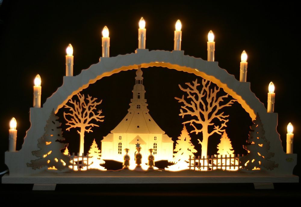 Schwibbogen Seiffener Kirche 10 Kerzen 70cm LED Vorbel. Erzgebirge Lichterbogen