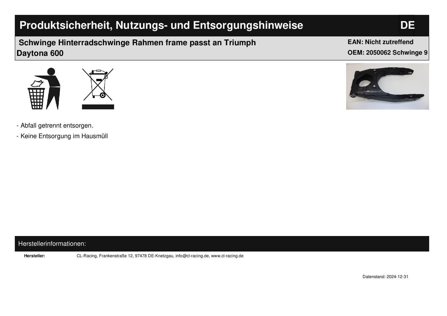 Schwinge Hinterradschwinge Rahmen frame passt an Triumph Daytona 600 In dieser Auktion gibt es folgenden Artikel zu kaufen: originale Schwinge (siehe Foto) Fahrzeug: passend für Triumph Daytona 600 Erstzulassung: 03.2005 (passt evtl. auch für andere Modelle, bitte erst nachfragen!) Lieferumfang: sie