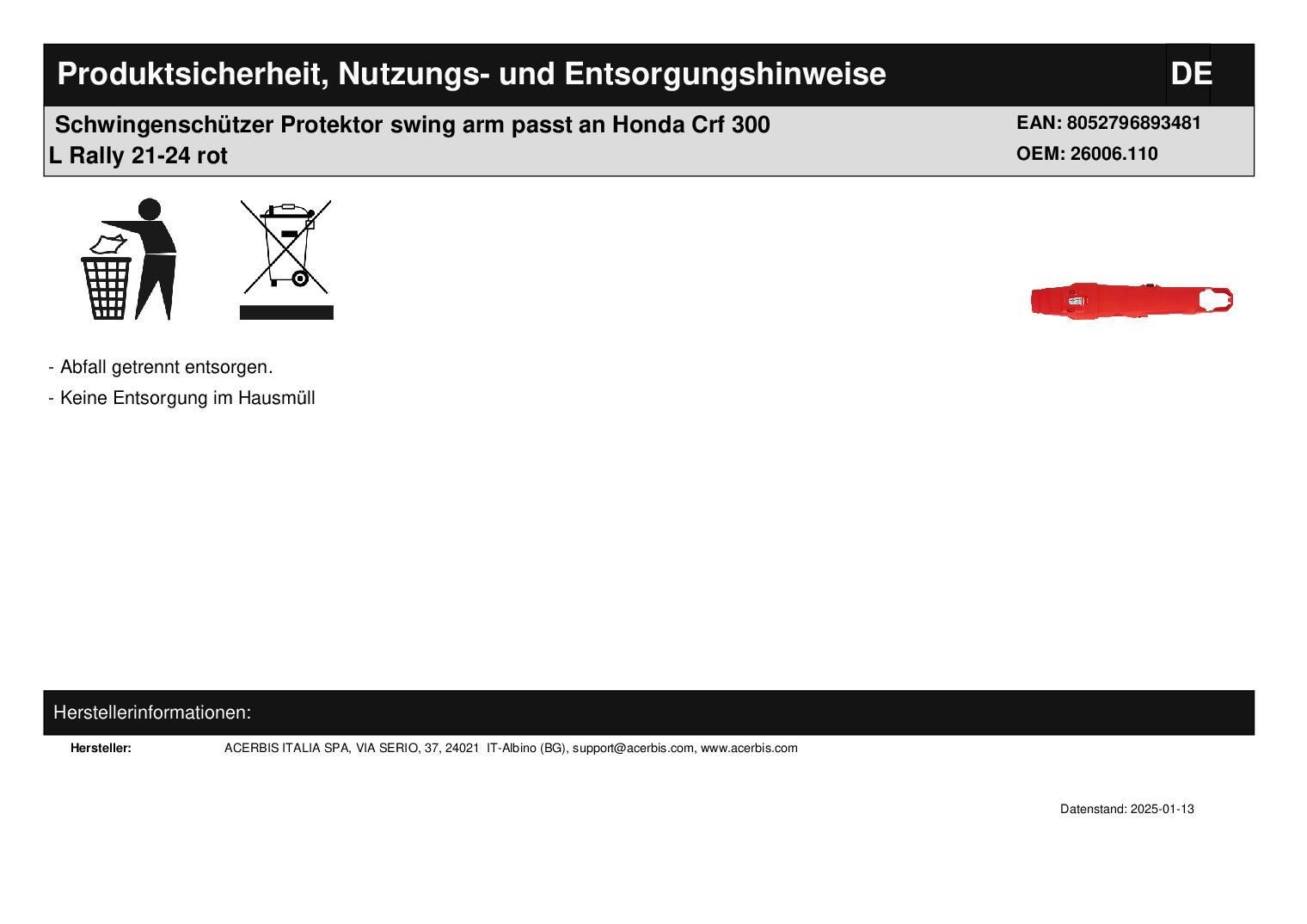 Acerbis Schwingenschützer Protektor swing arm passt an Honda Crf 300 L Rally 21-25 rot