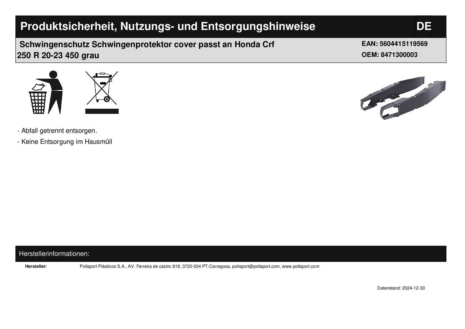 Polisport Schwingenschutz Schwingenprotektor cover passt an Honda Crf 250 R 20-23 450 grau