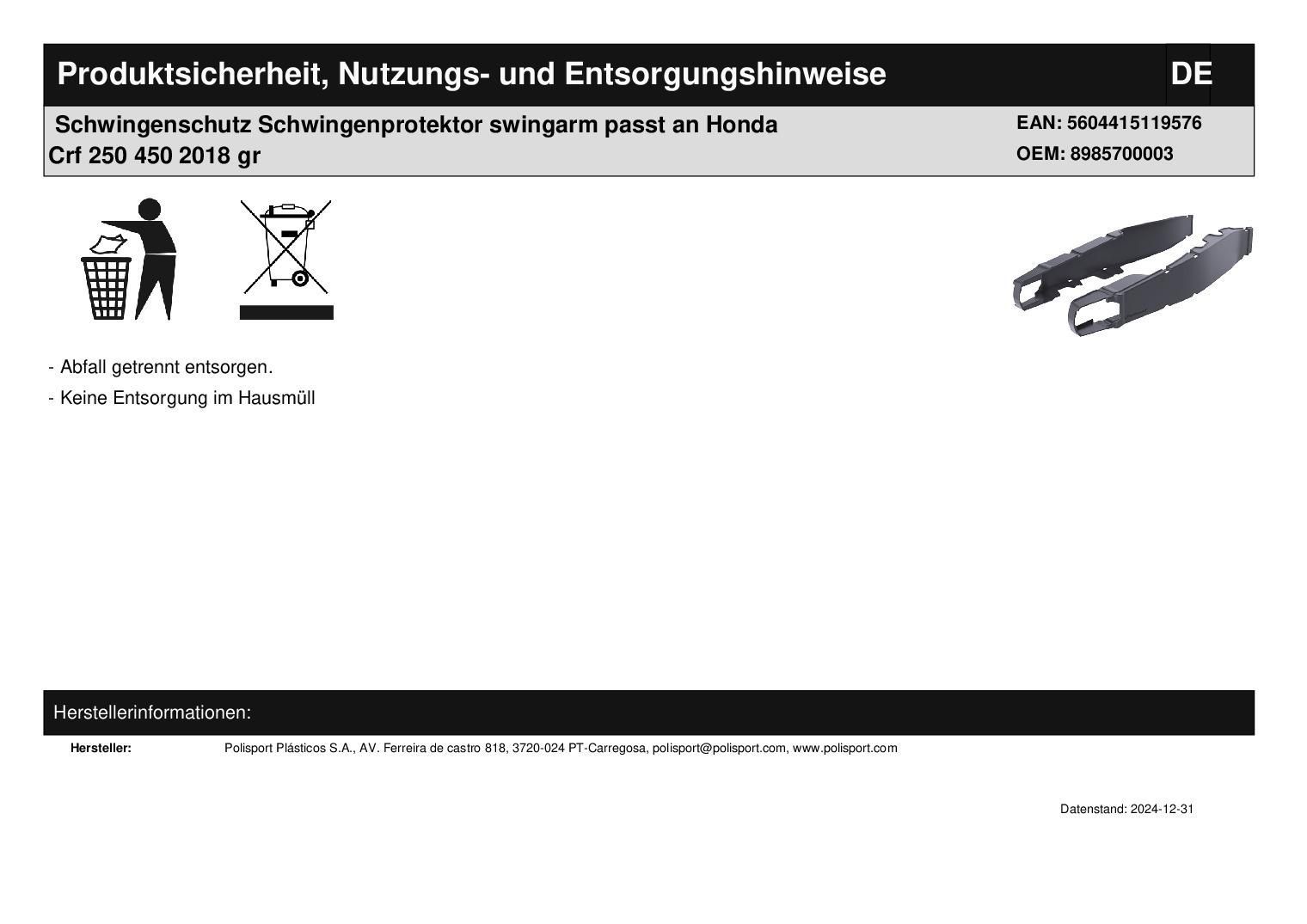 Polisport Schwingenschutz Schwingenprotektor swingarm passt an Honda Crf 250 450 2018 gr