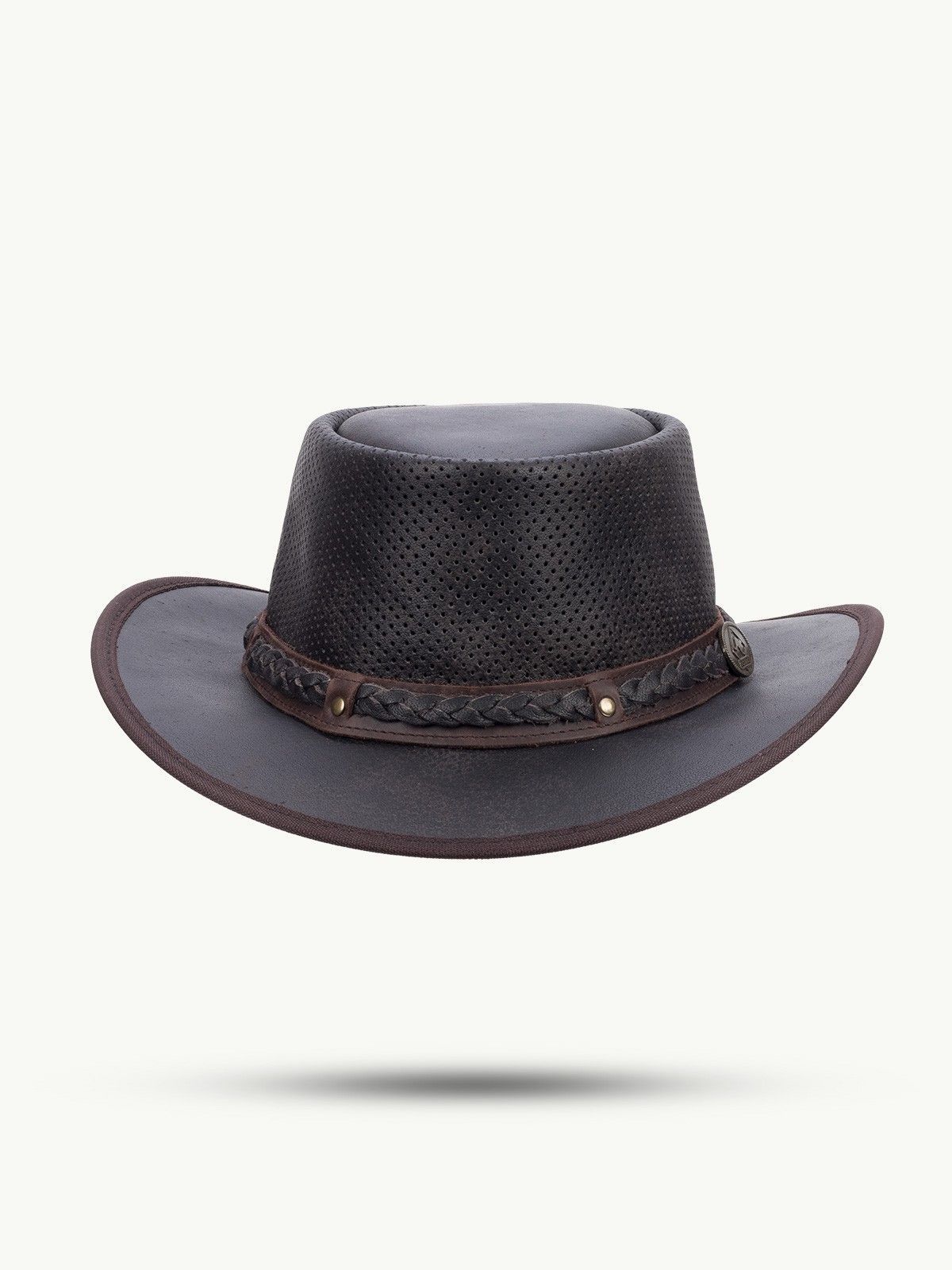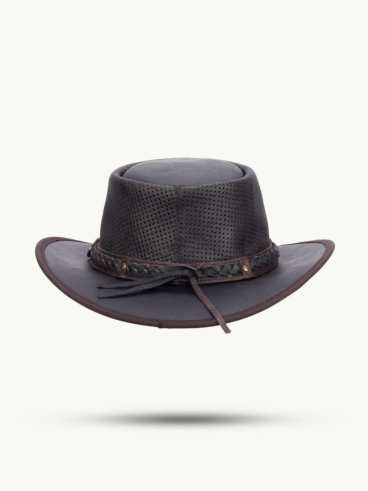 Knautschbarer Sommerhut aus Leder mit perforierter Krone für optimale Belüftung auch an warmen Tagen. Geflochtenes Hutband.
