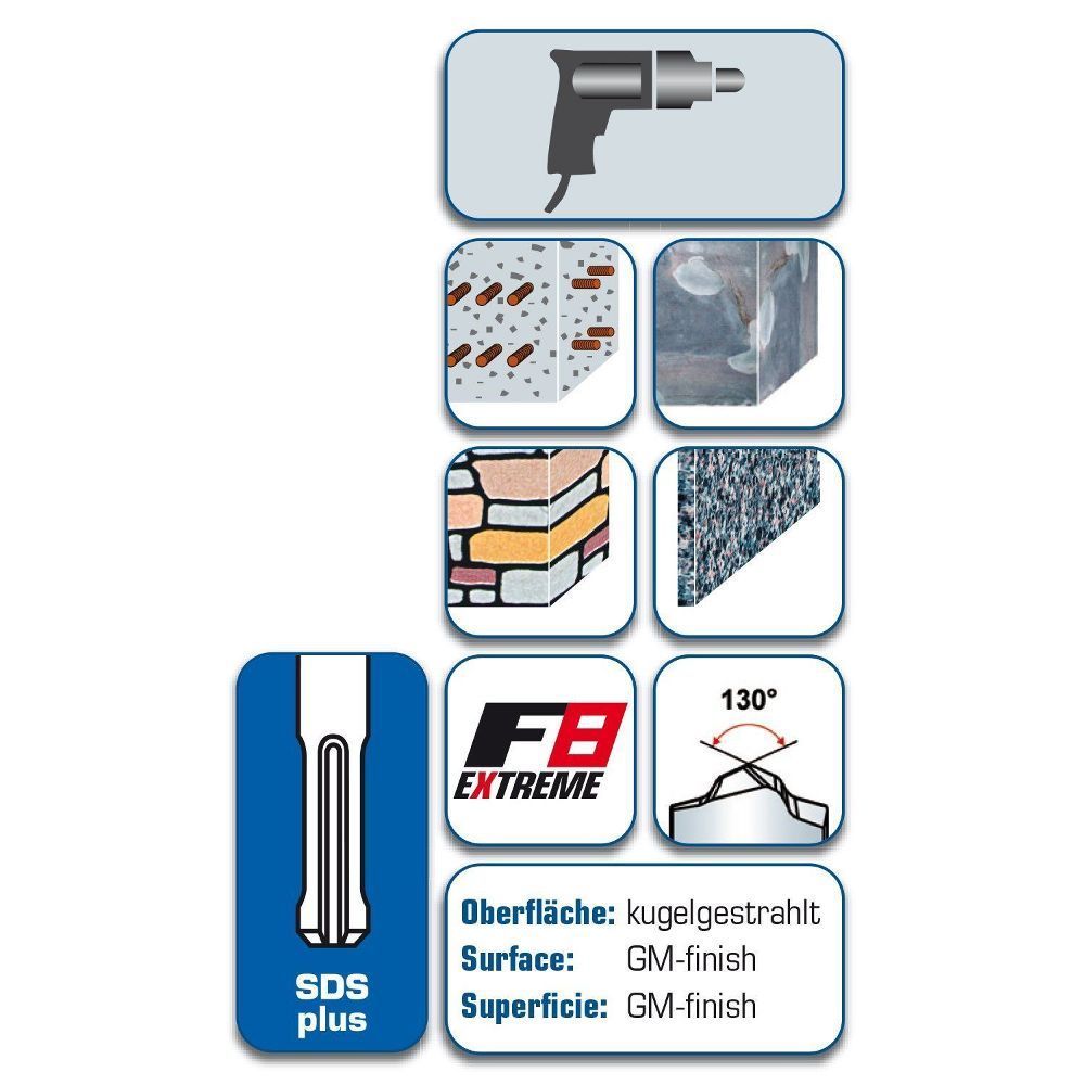 zum Verkauf steht 1 SDS Plus Betonbohrer vierschneidig - 1 Stück - Durchmesser oben wählbar - Gesamtlänge 160mm , Nutzlänge 100mm - mit SDS Plus Schaft - mit 4 Vollhartmetall-Schneiden - vibrationsarmer Lauf und sehr gute Bohrmehlförderung - geeignet für folgende Materialien: Stahlbeton Hartgestein