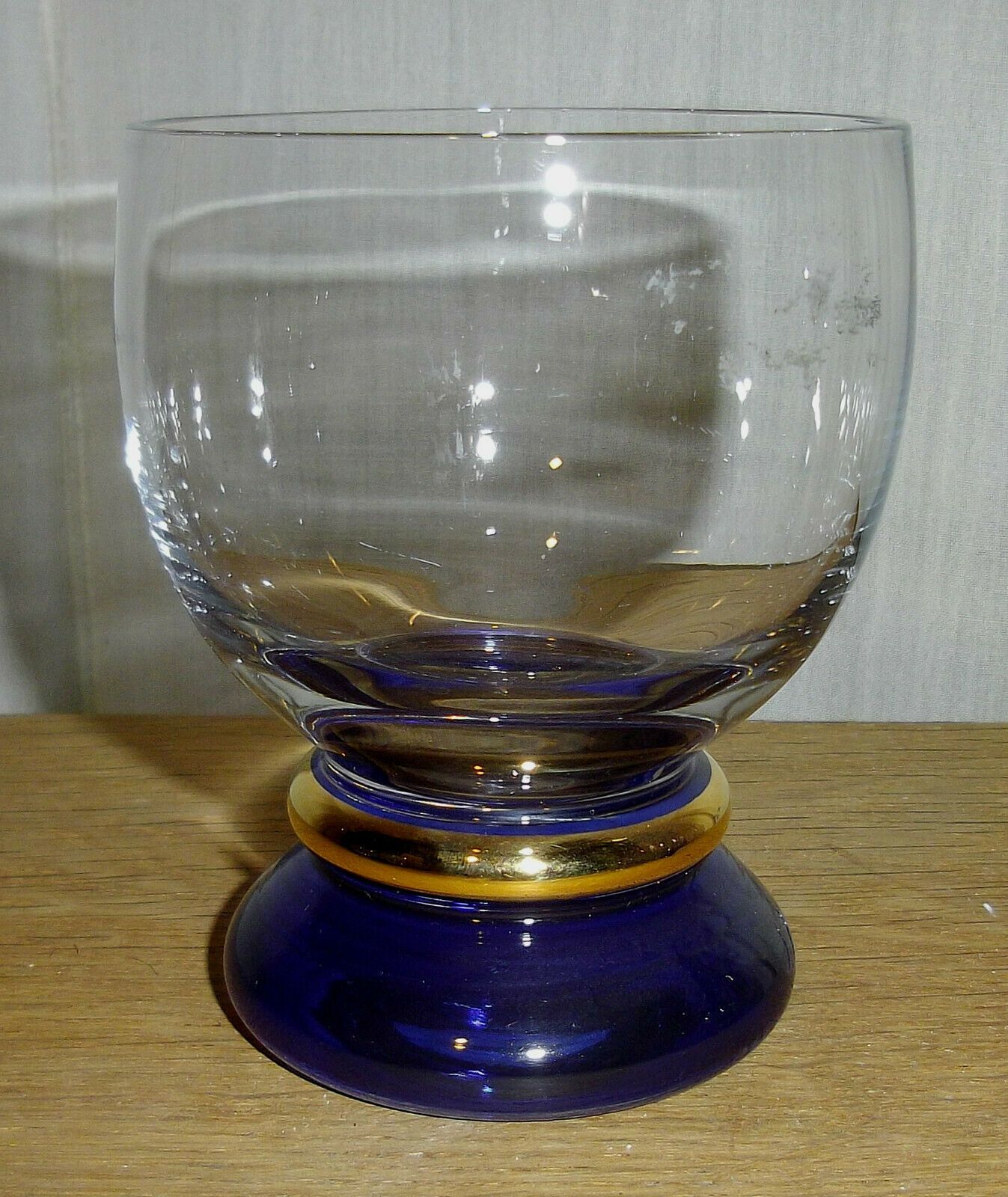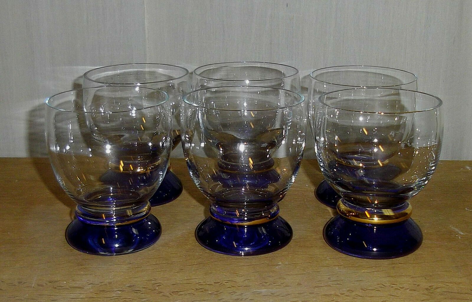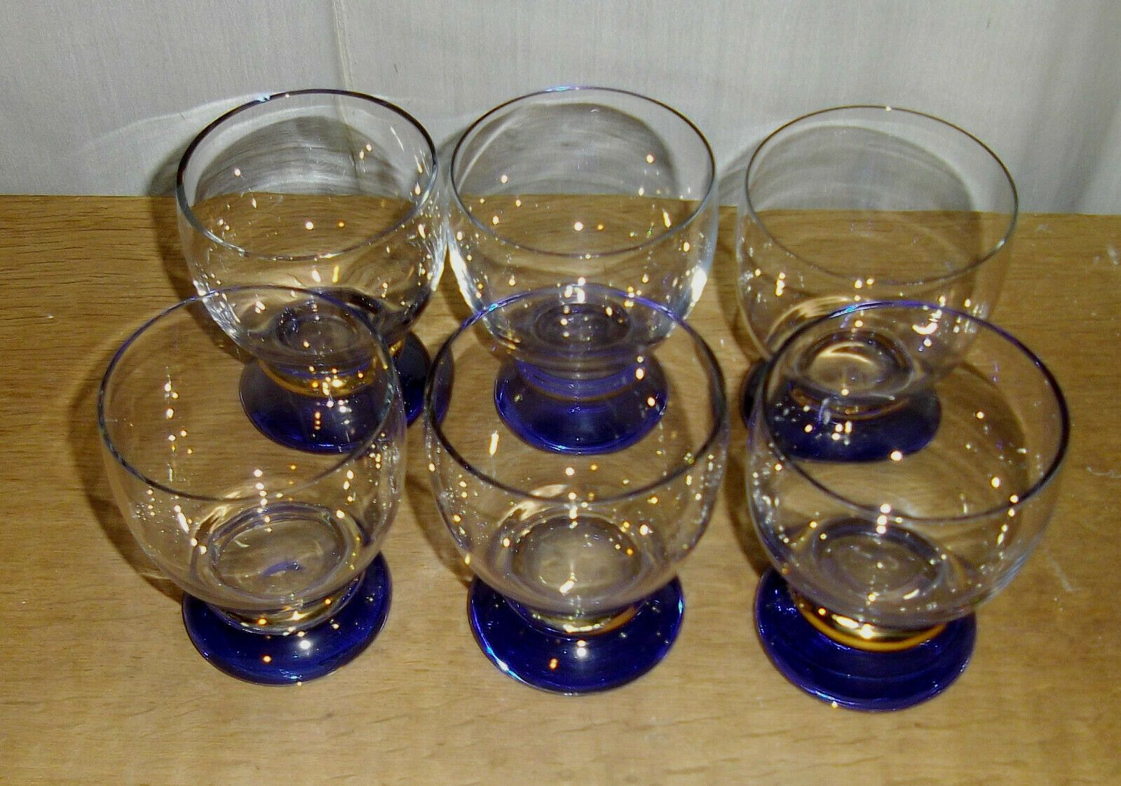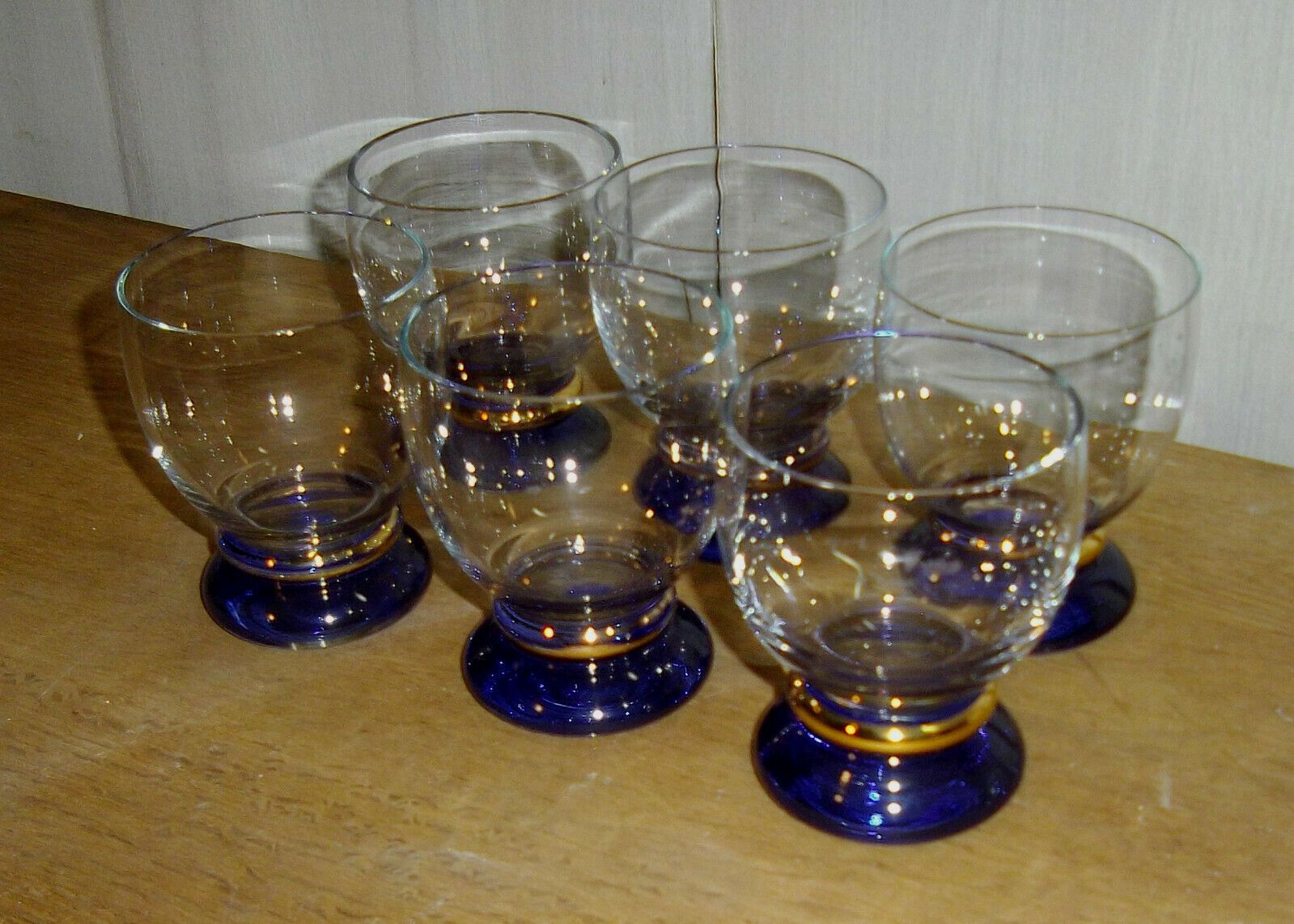 6 schwere Cognac-Gläser um 1960. Herkunft: Dänemark. Alle mundgeblasen mit Abriss. Sehr schwer, gold blau. Maße: Höhe 10,5 cm. Antikes am Deich - Inh: Oliver Kipp-Trense G M T Sprache erkennen Afrikaans Albanisch Arabisch Armenisch Aserbaidschanisch Baskisch Bengalisch Bosnisch Bulgarisch Burmesisch