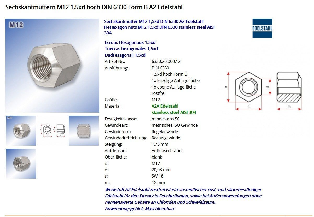 Sechskantmuttern M12 1,5xd hoch DIN 6330 Form B A2 Edelstahl Sechskantmutter M12 1,5xd DIN 6330 A2 Edelstahl Hexagon nuts M12 1,5xd DIN 6330 stainless steel AISI 304 Ecrous Hexagonaux 1,5xd Tuercas hexagonales 1,5xd Dadi esagonali 1,5xd Artikel-Nr.: 6330.20.000.12 Ausführung: DIN 6330 1,5xd hoch For