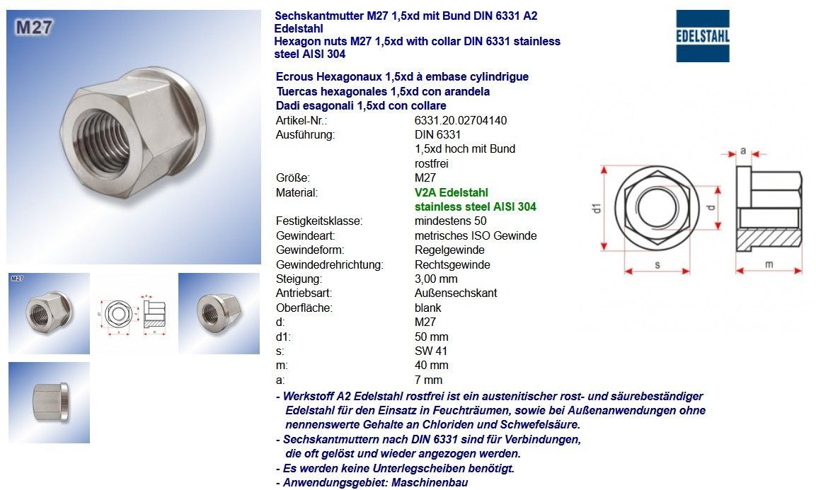 Sechskantmuttern M27 1,5xd hoch DIN 6331mit Bund A2 Edelstahl Sechskantmutter M27 1,5xd mit Bund DIN 6331 A2 Edelstahl Hexagon nuts M27 1,5xd with collar DIN 6331 stainless steel AISI 304 Ecrous Hexagonaux 1,5xd à embase cylindrigue Tuercas hexagonales 1,5xd con arandela Dadi esagonali 1,5xd