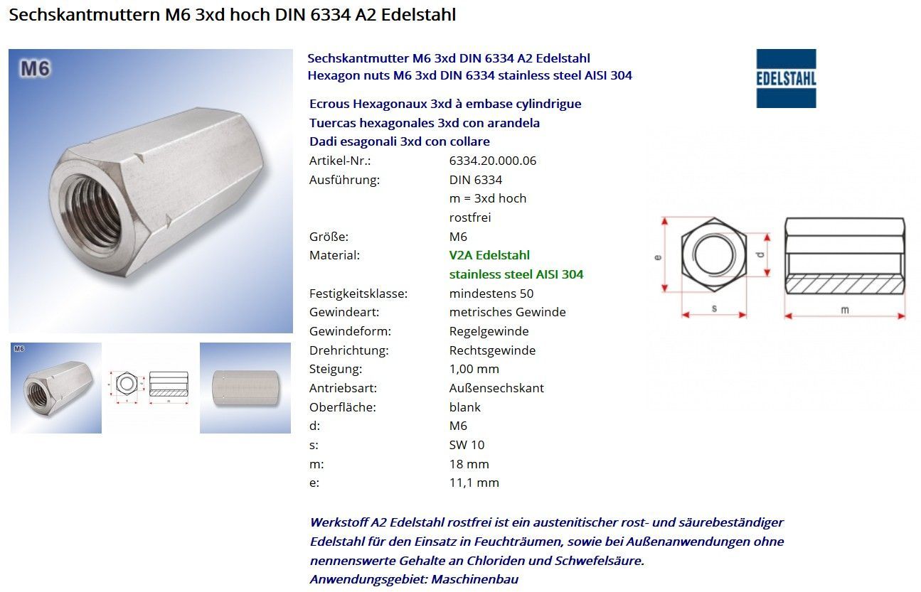 Sechskantmuttern M6 3xd hoch DIN 6334 A2 Edelstahl Sechskantmutter M6 3xd DIN 6334 A4 Edelstahl Hexagon nuts M6 3xd DIN 6334 stainless steel AISI 316 Ecrous Hexagonaux 3xd à embase cylindrigue Tuercas hexagonales 3xd con arandela Dadi esagonali 3xd con collare Artikel-Nr.: 6334.40.000.06 Ausf