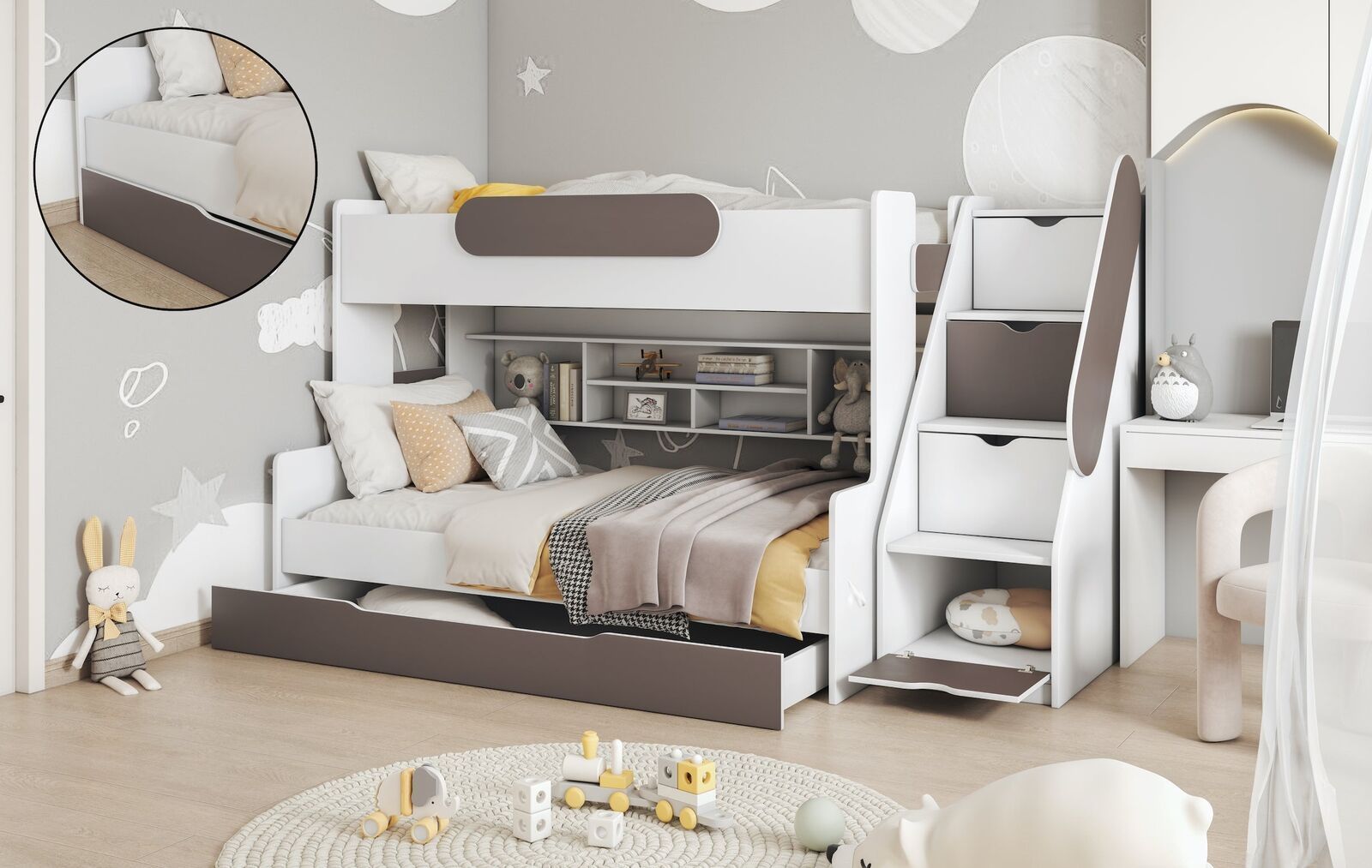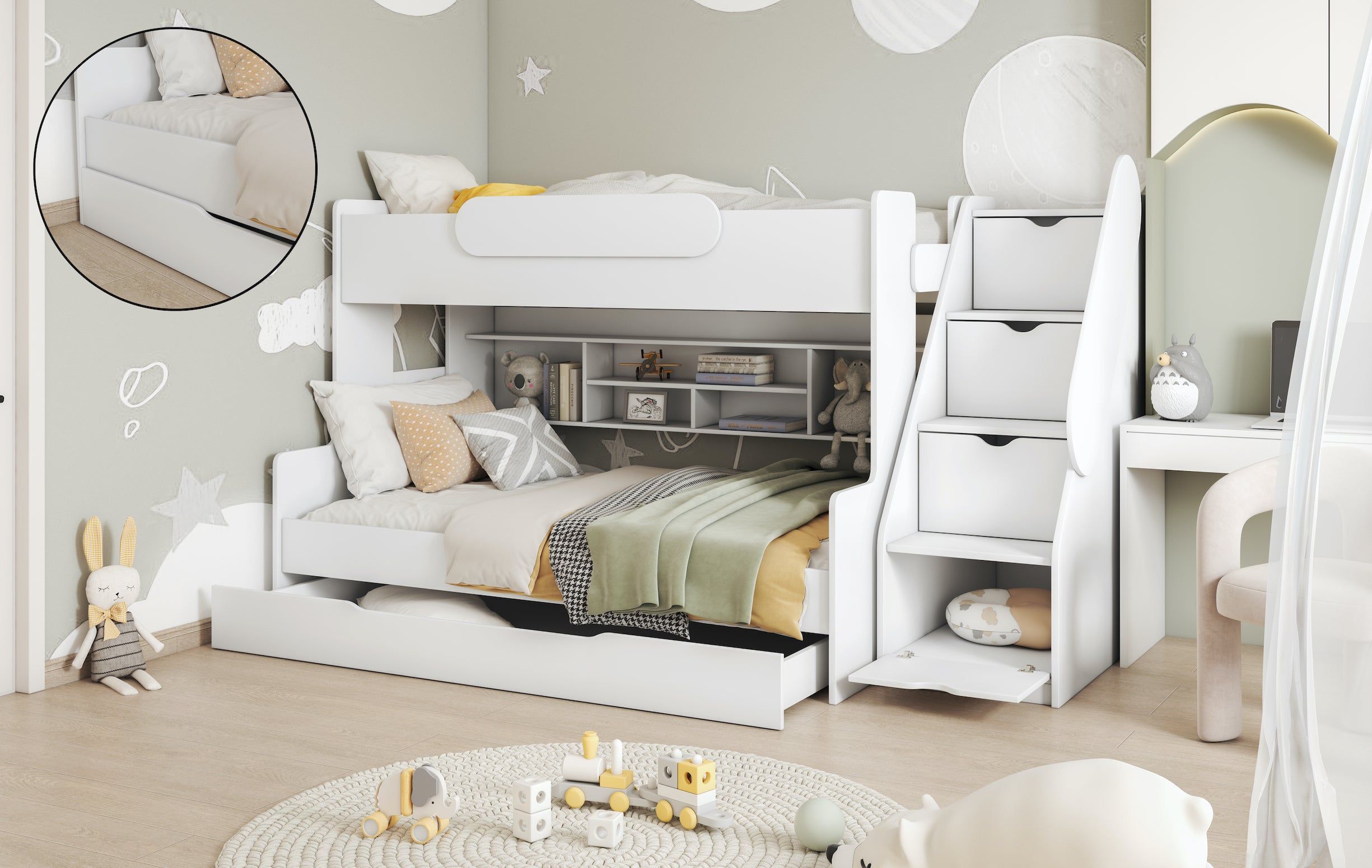 SEGAM Etagenbett Stockbett Kinderbett 4 Regale 1 Schublade 2 Matratzen inklusive