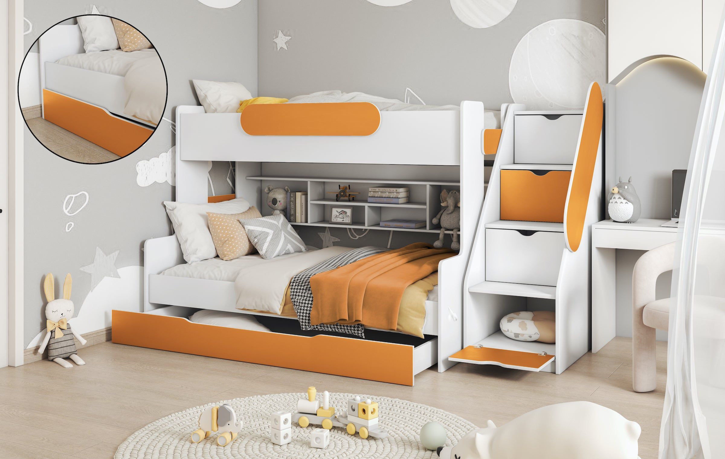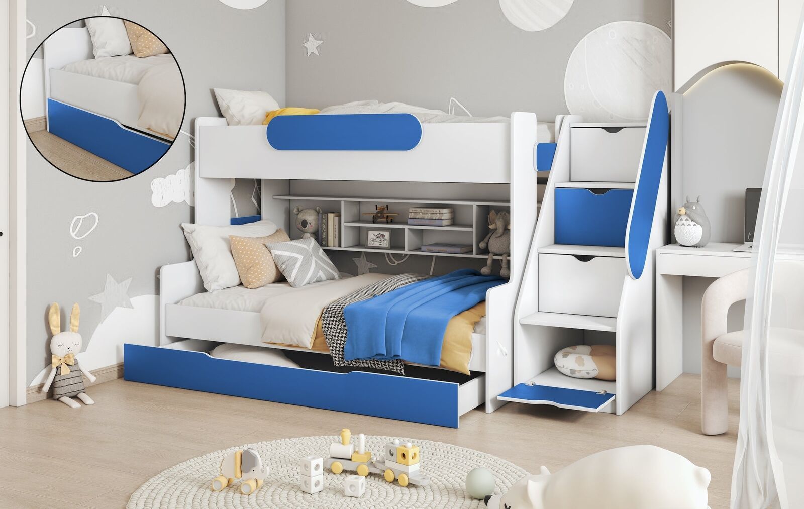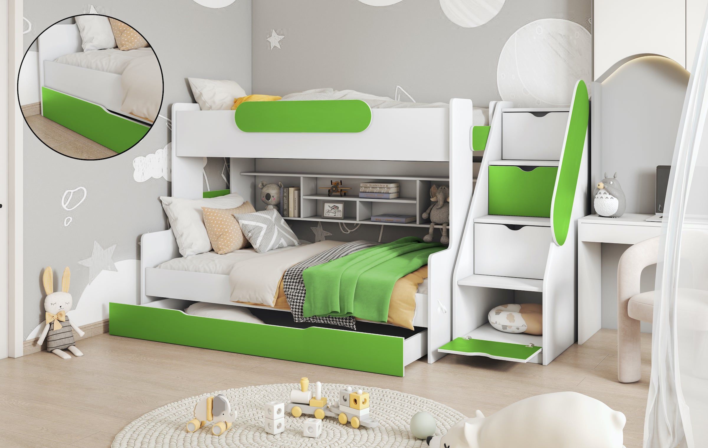 Das SEGAM Etagenbett, Stockbett Kinderbett ist in Weiß (Grundfarbe – nicht änderbar) in Kombination mit den Farben Blau, Grün, Orange und Rosa erhältlich. Das Bett besteht aus laminierter Platte. 22 mm mit ABS-Kante belegt. Die Treppe kann auf der rechten oder linken Seite platziert werden. Di