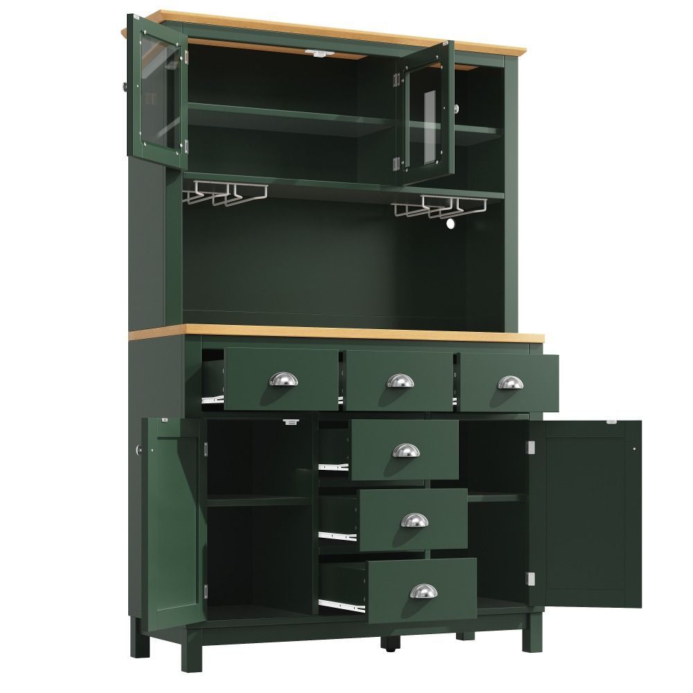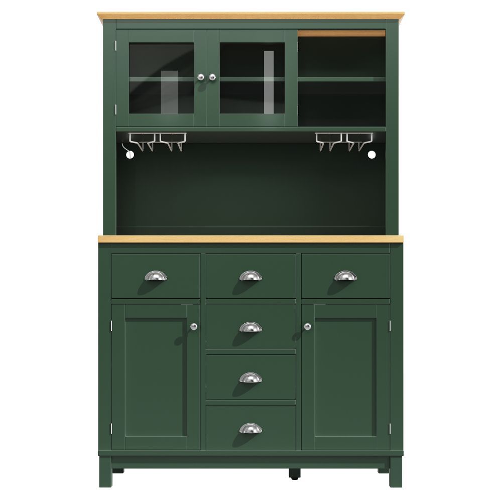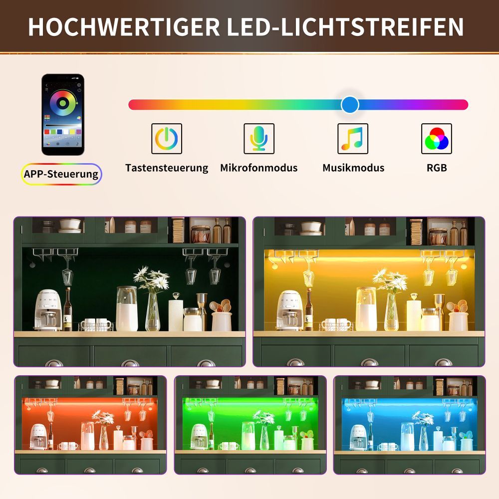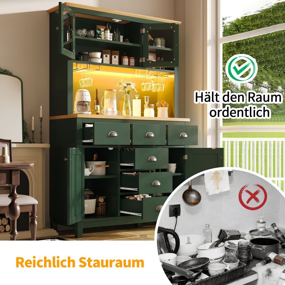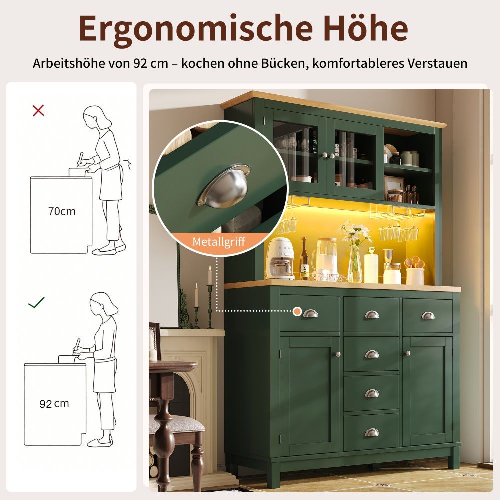 Dieser Aufbewahrungsschrank im Landhausstil vereint praktischen Stauraum mit wohnlichem Charme. Die grün-weiße Gestaltung bringt eine frische, elegante Note in Küche oder Essbereich. Fünf Türen, eine integrierte LED-Lichtleiste und praktische Getränkehalter bieten Platz für Geschirr, Vorräte und Gläser. Die robuste MDF-Ausführung ist pflegeleicht und alltagstauglich.